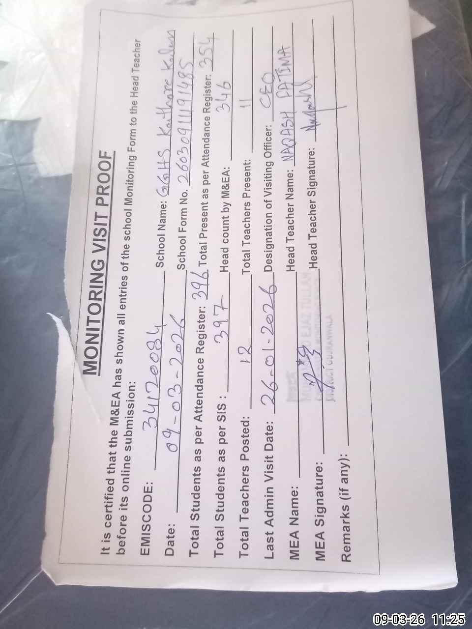 | Attendance Register | Head Teacher | MEA with School | Visit Proof |