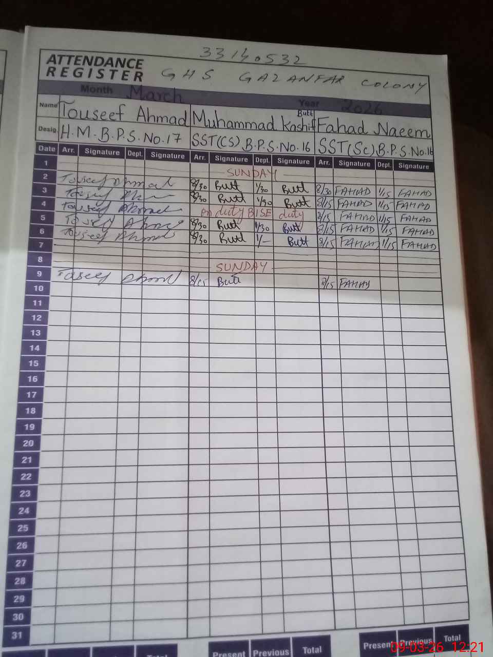 | CNIC | Full Name | Designation | R/C | Absence During Last Calender Month |