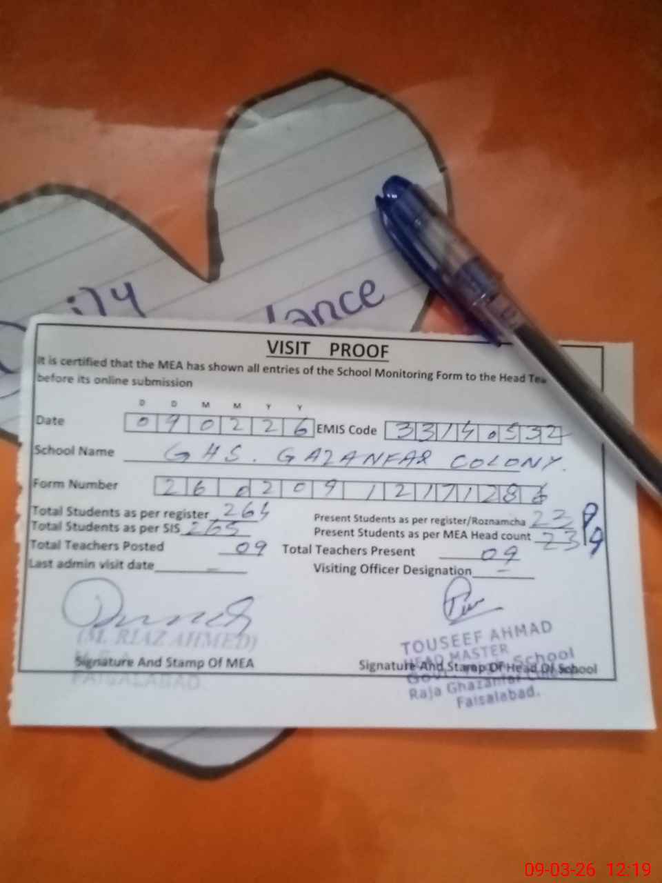 | Attendance Register | Head Teacher | MEA with School | Visit Proof |