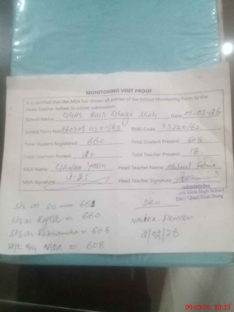 | Attendance Register | Head Teacher | MEA with School | Visit Proof |