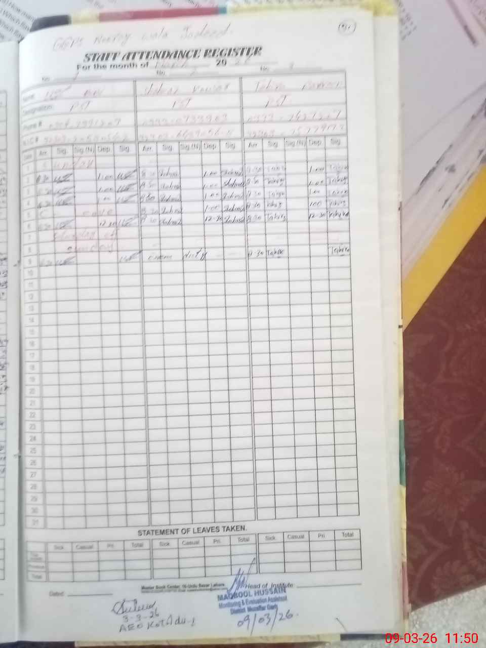 | CNIC | Full Name | Designation | R/C | Absence During Last Calender Month |