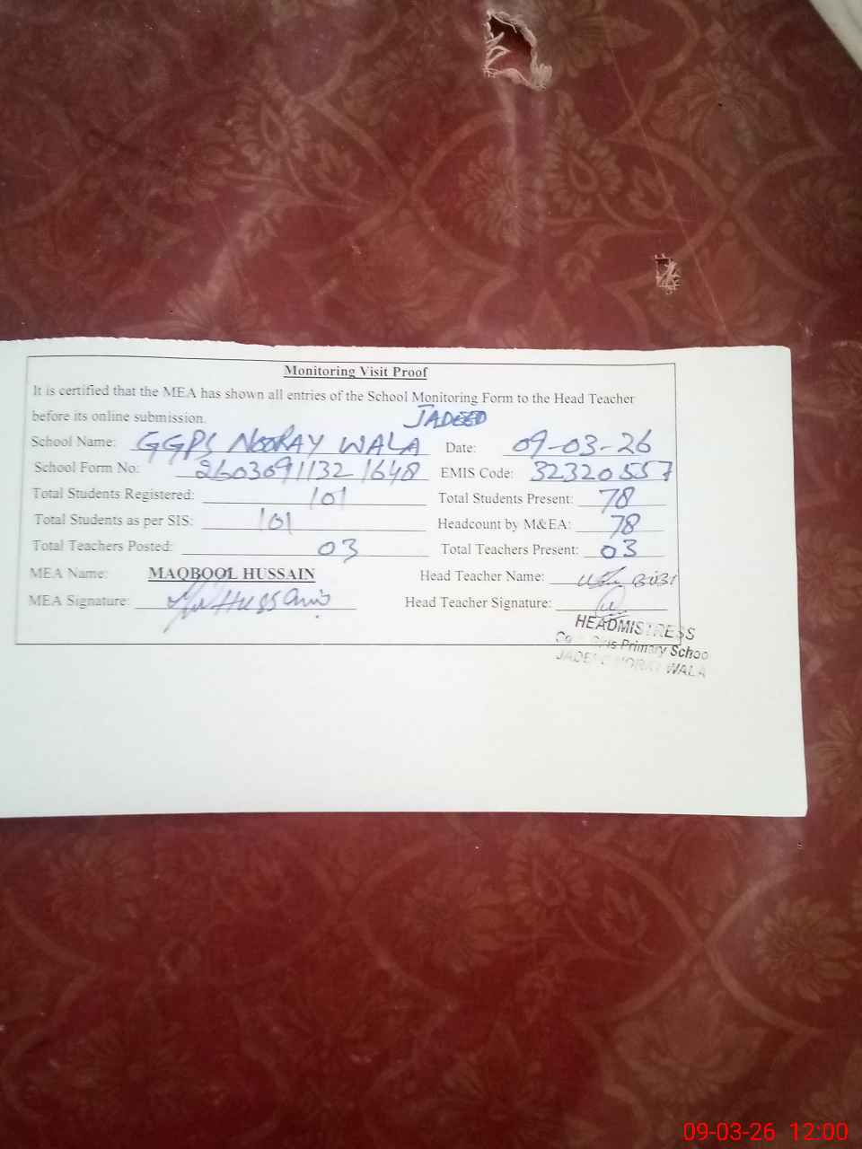 | Attendance Register | Head Teacher | MEA with School | Visit Proof |