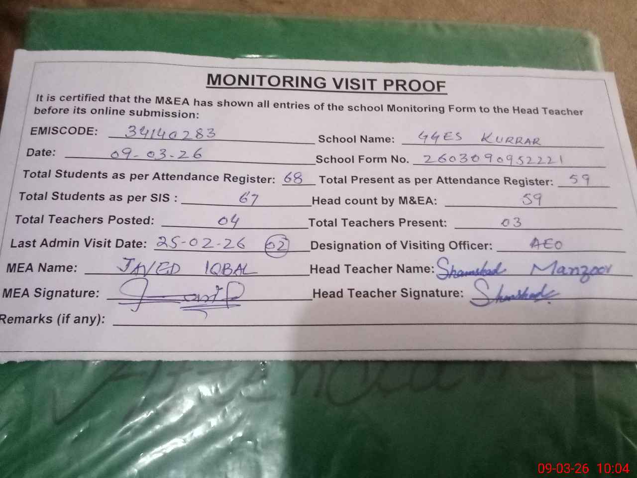 | Attendance Register | Head Teacher | MEA with School | Visit Proof |
