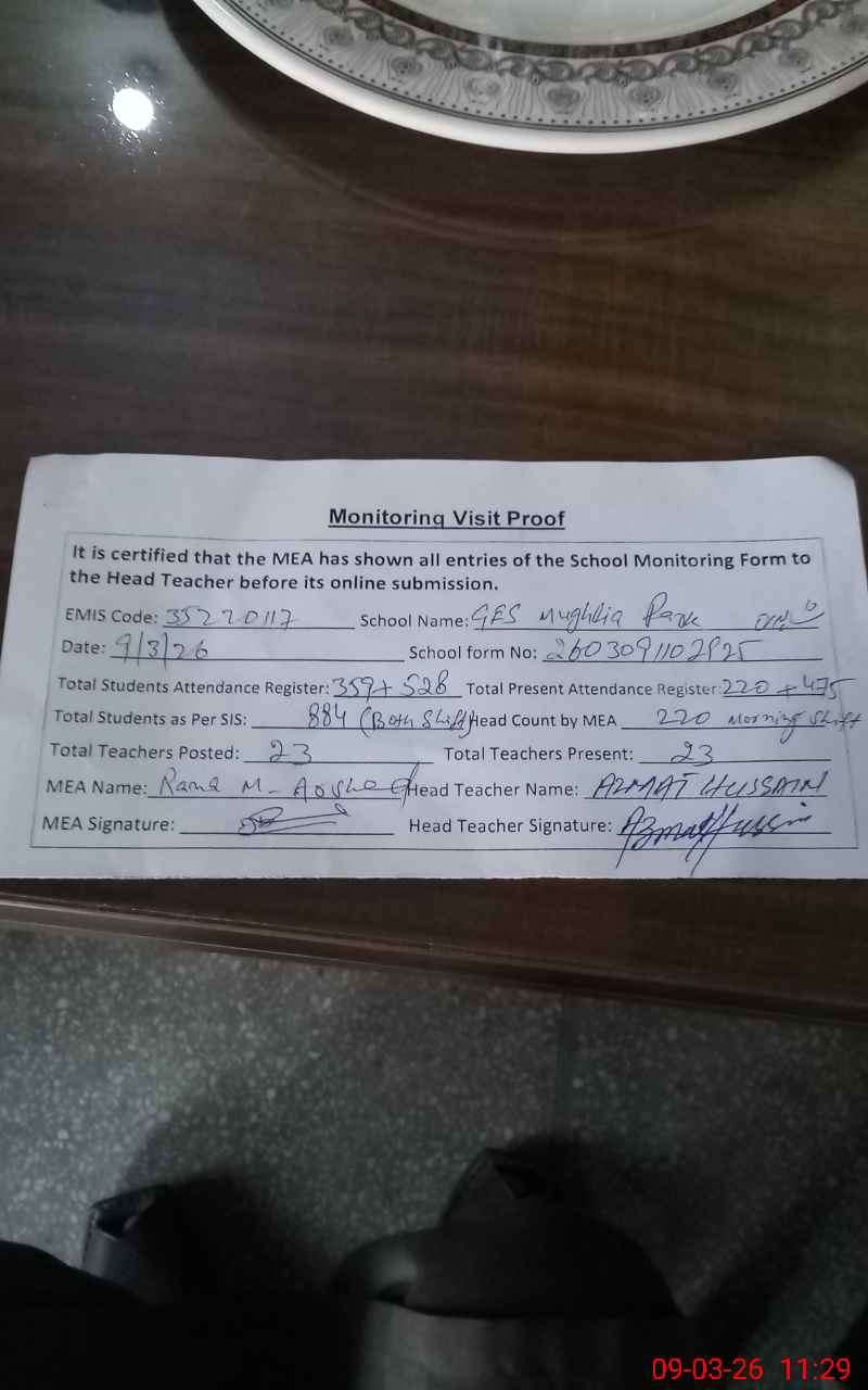 | EMIS Code: 35220117 | Name of School: GES MUGHLIA PARK SHAHDARA LAHORE | |||