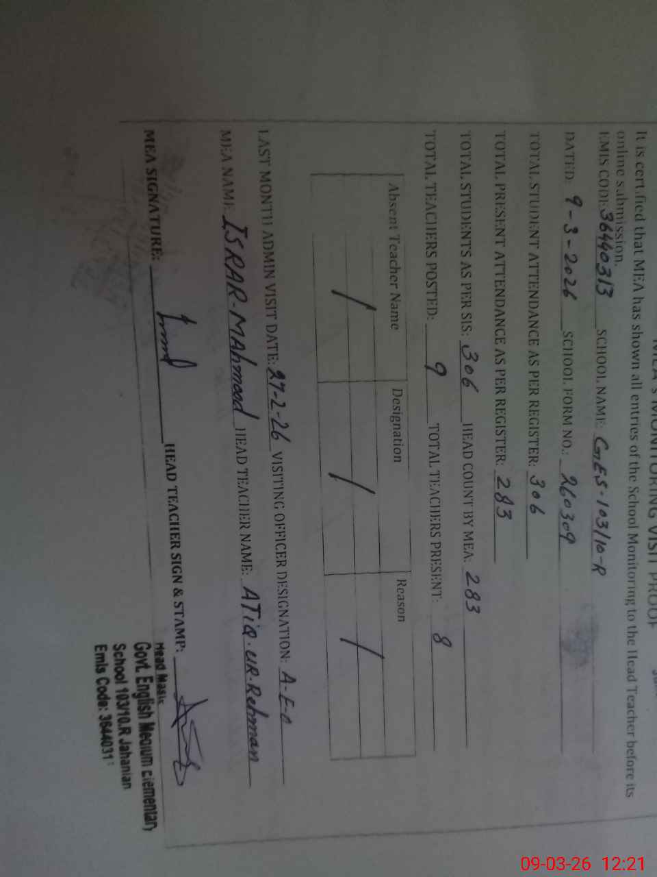 | Attendance Register | Head Teacher | MEA with School | Visit Proof |