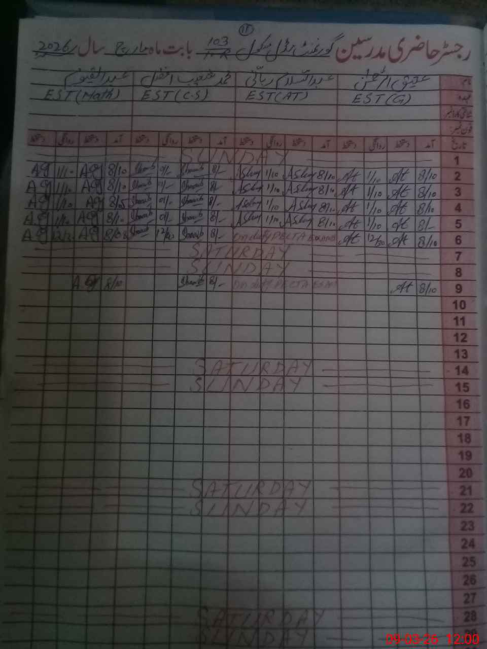 | 36**** | Ab**** Sa**** Ra**** | EST Arabic | Regular | 0 | 0 | 0 | 0 | 0 | 0 | 0 | 0 | 0 | Exam Duty |