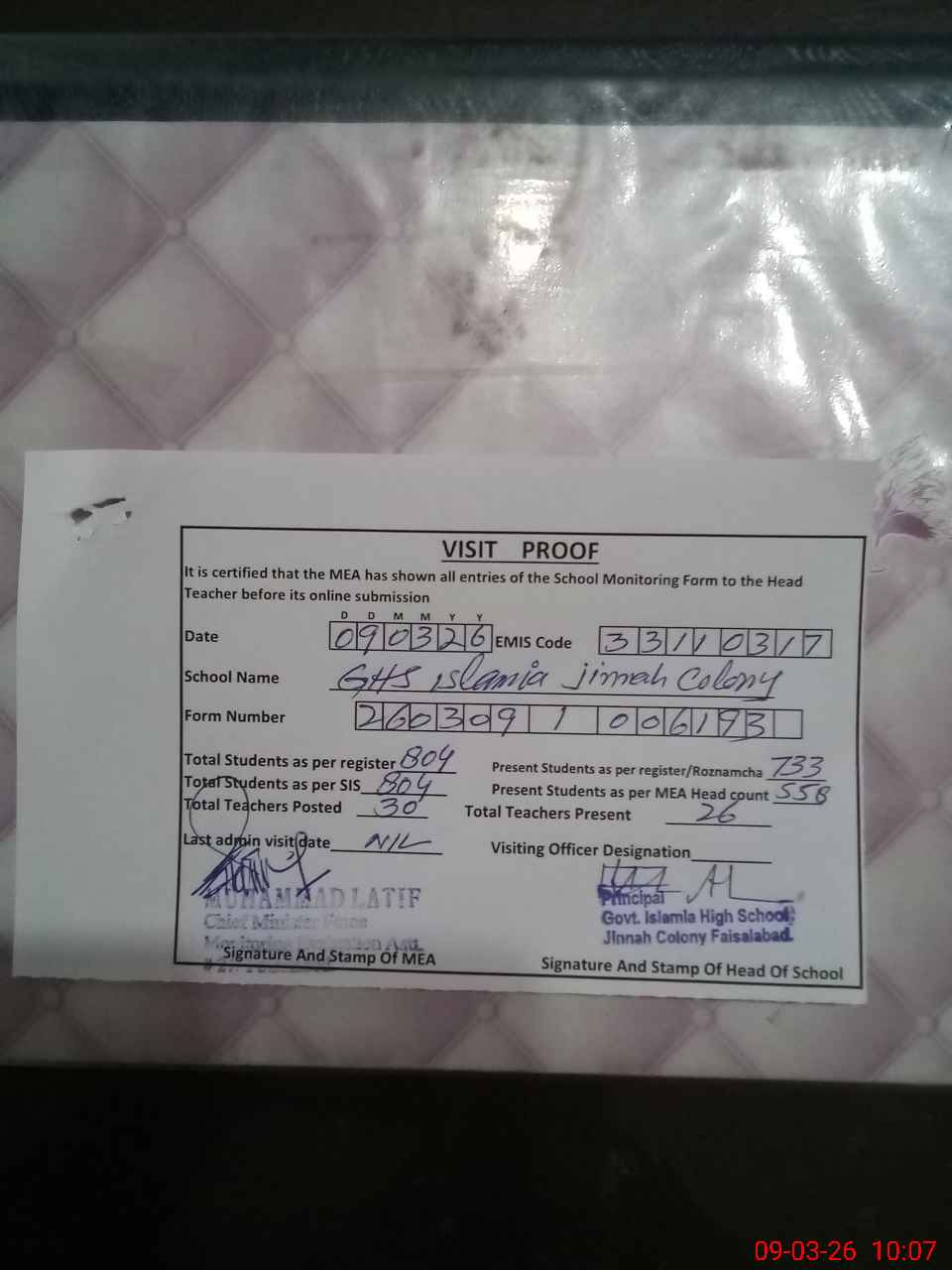 | Certified that this School was Inspected by the Undersigned MEA/DMO Today and the Information Stated Above is as Per Record. | |||||