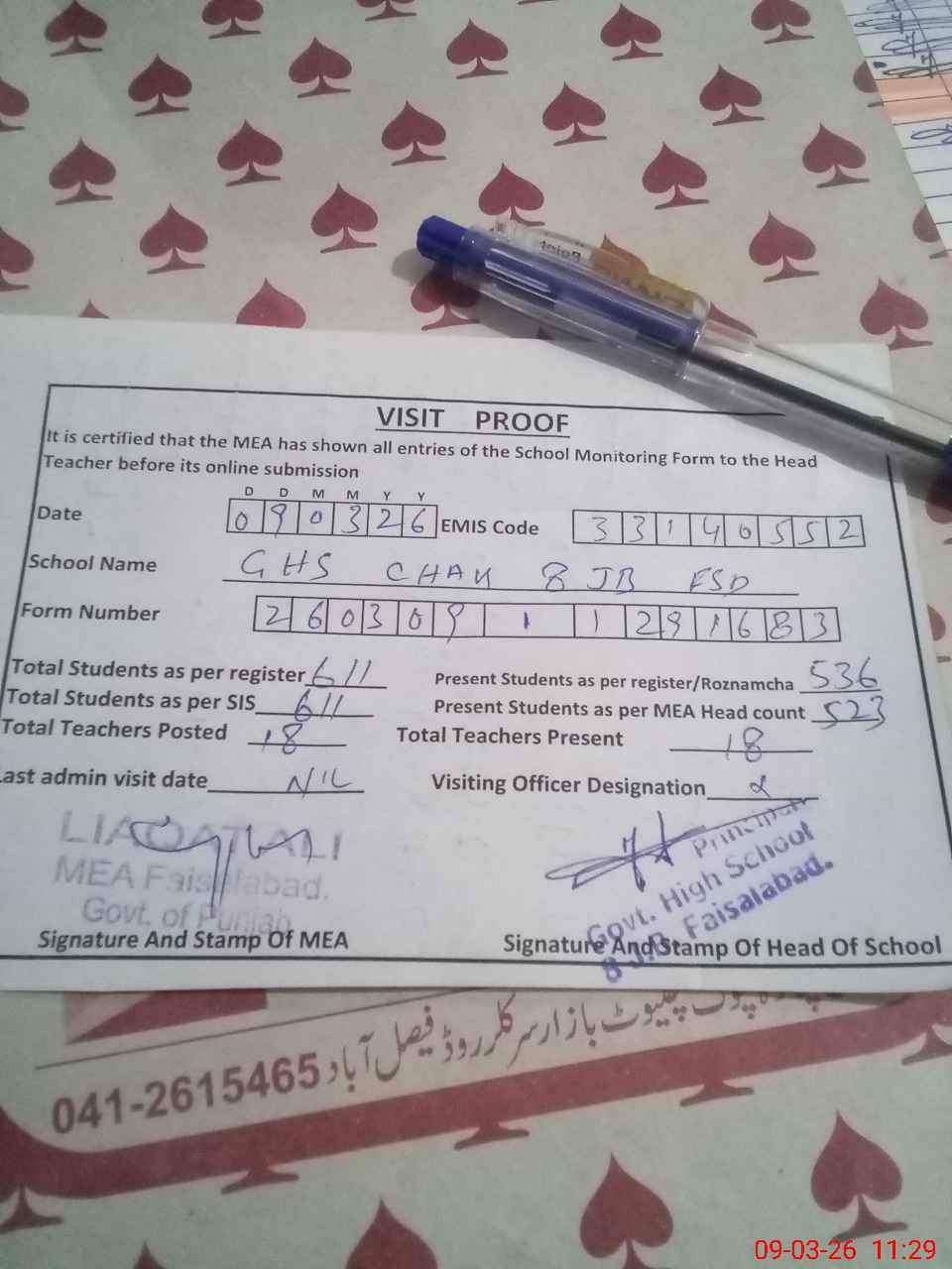 | Attendance Register | Head Teacher | MEA with School | Visit Proof |