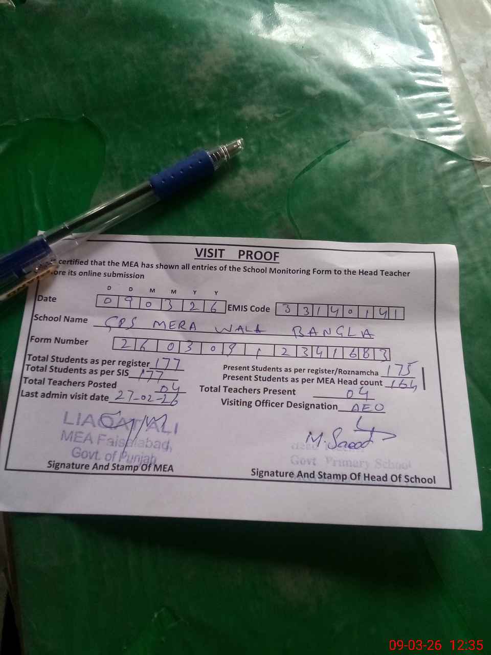 | EMIS Code: 33140141 | Name of School: GPS MERA WALA BANGLA | |||