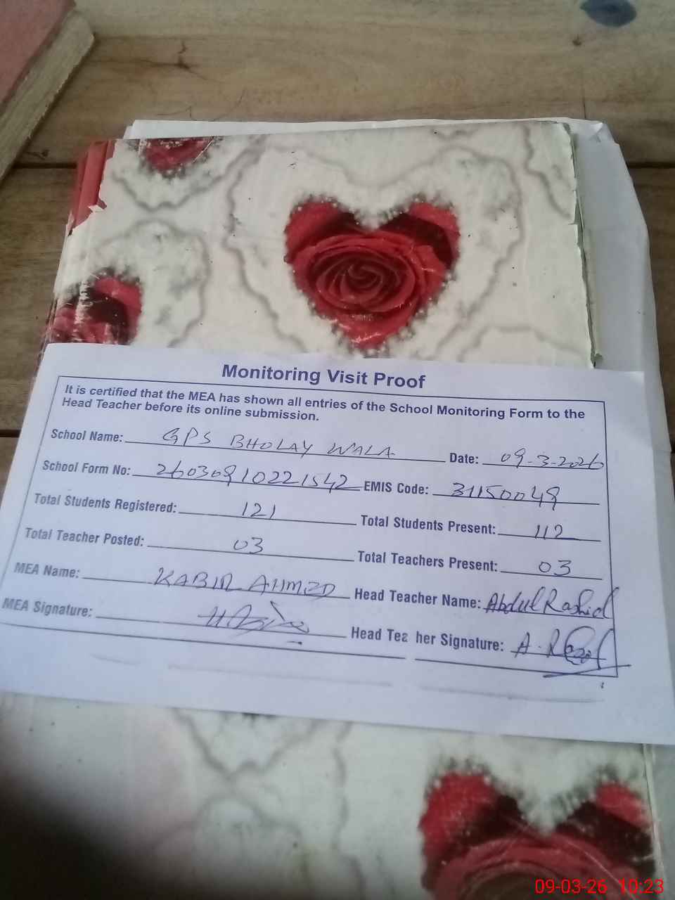| Attendance Register | Head Teacher | MEA with School | Visit Proof |