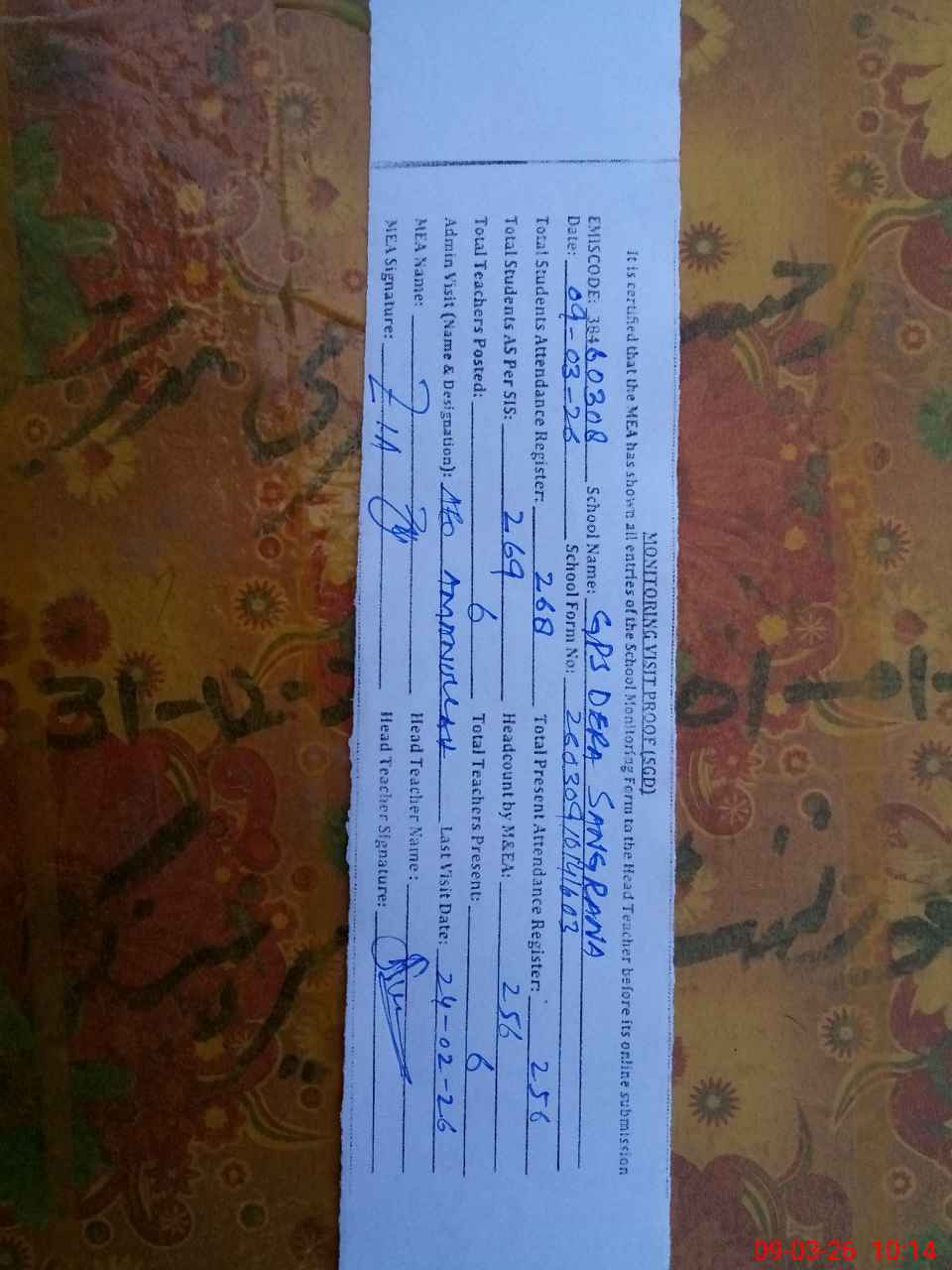| Attendance Register | Head Teacher | MEA with School | Visit Proof |