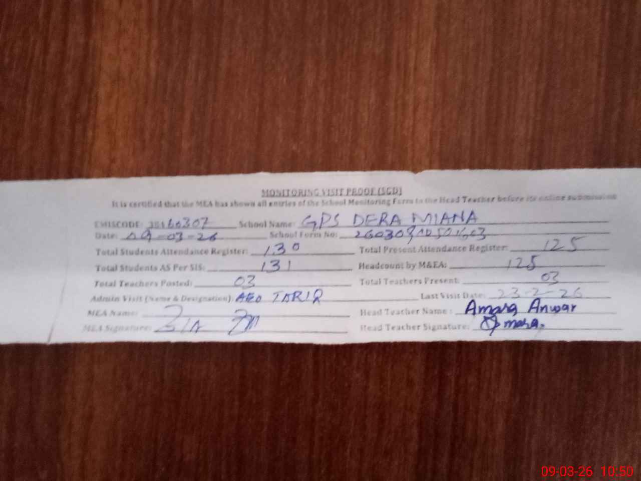 | Attendance Register | Head Teacher | MEA with School | Visit Proof |