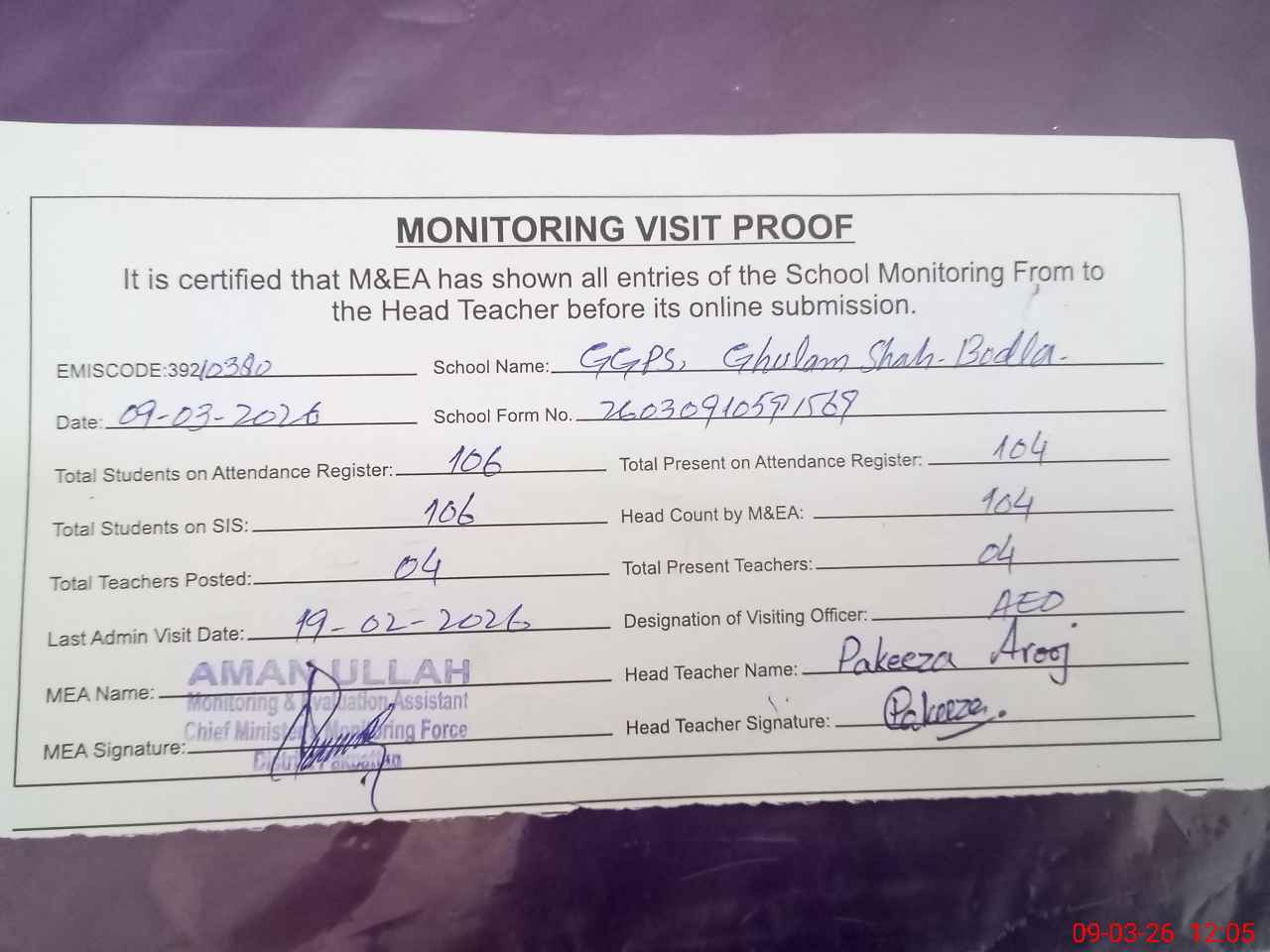 | Attendance Register | Head Teacher | MEA with School | Visit Proof |