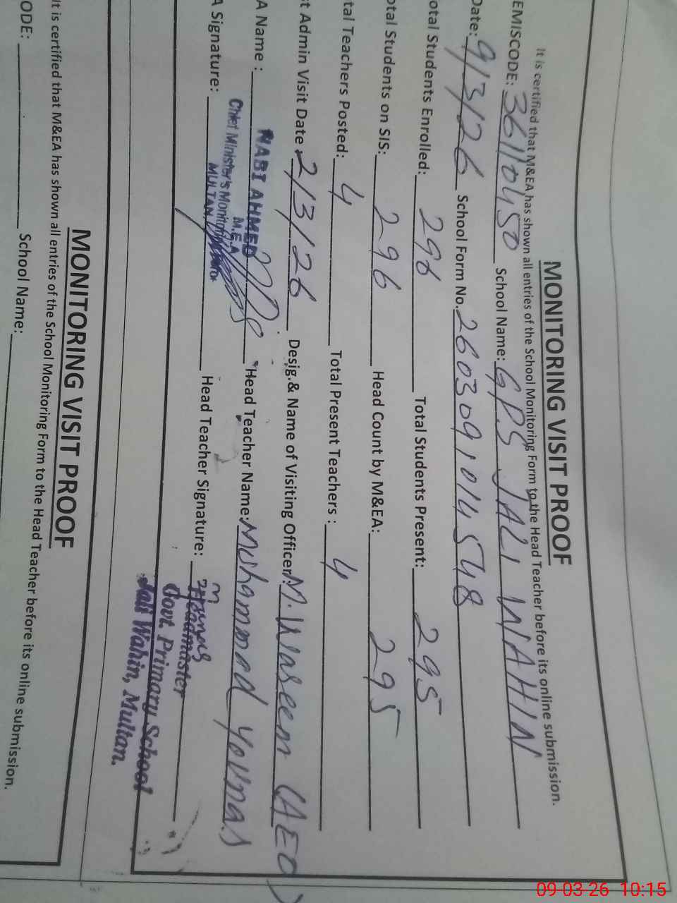 | Certified that this School was Inspected by the Undersigned MEA/DMO Today and the Information Stated Above is as Per Record. | |||||