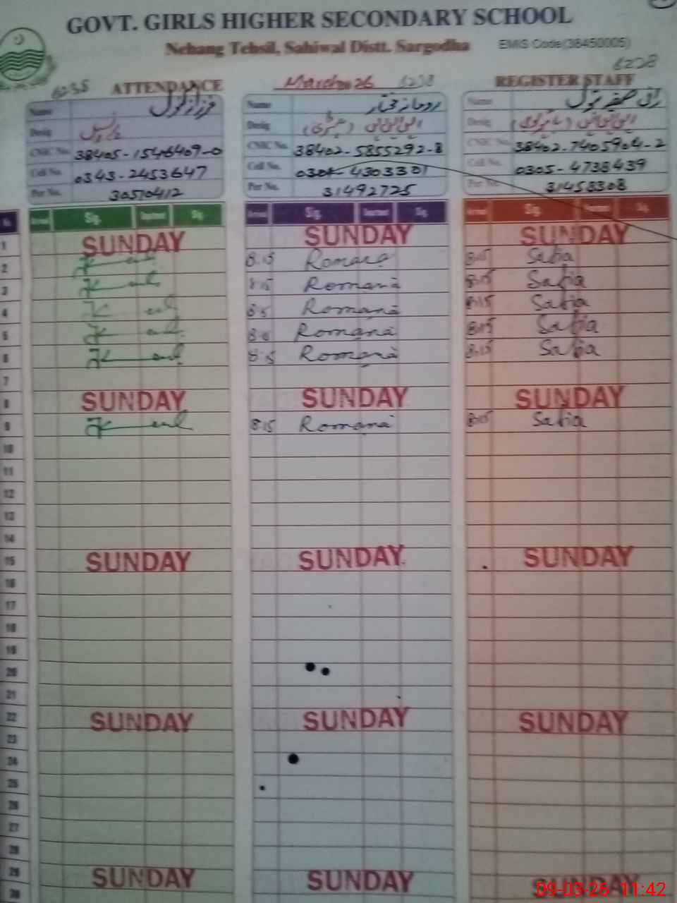 | CNIC | Full Name | Designation | R/C | Absence During Last Calender Month |
