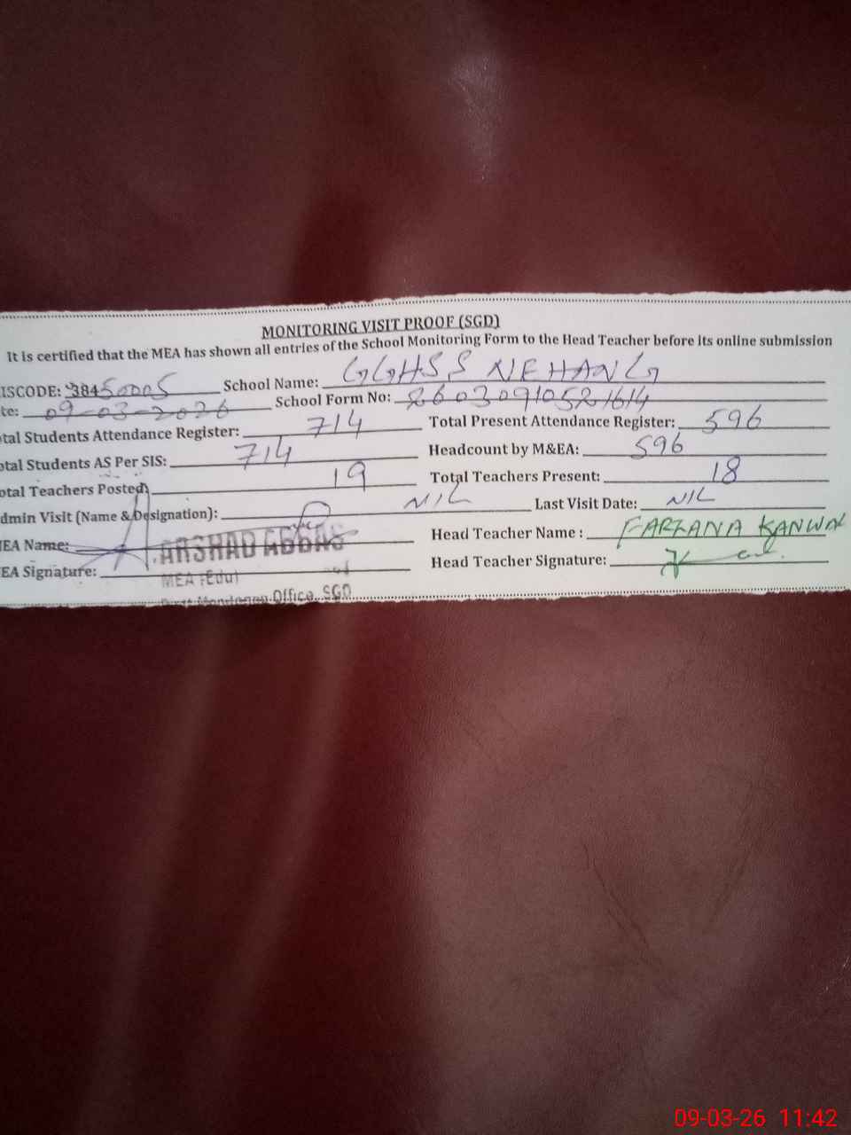 | Attendance Register | Head Teacher | MEA with School | Visit Proof |