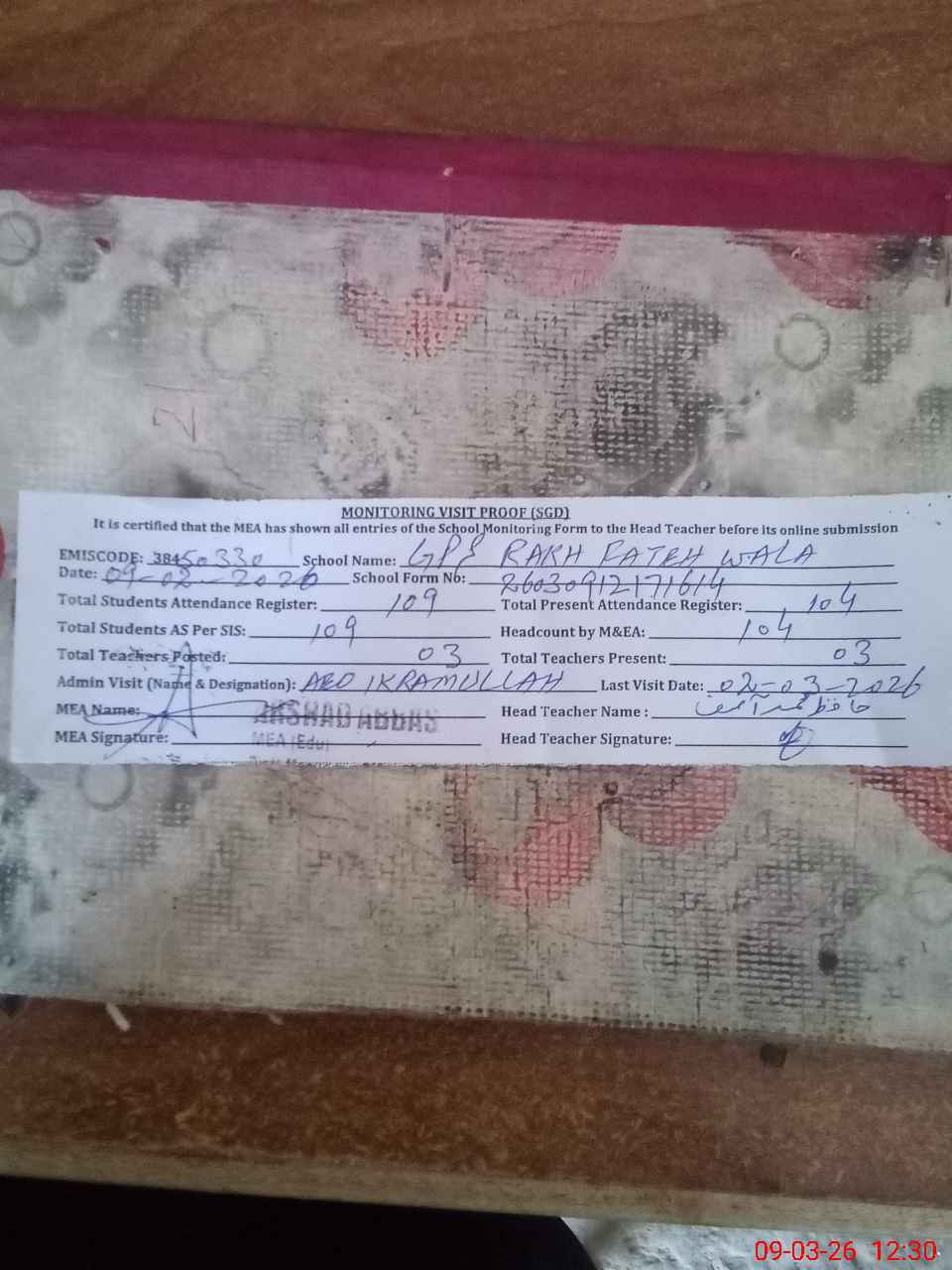 | Attendance Register | Head Teacher | MEA with School | Visit Proof |