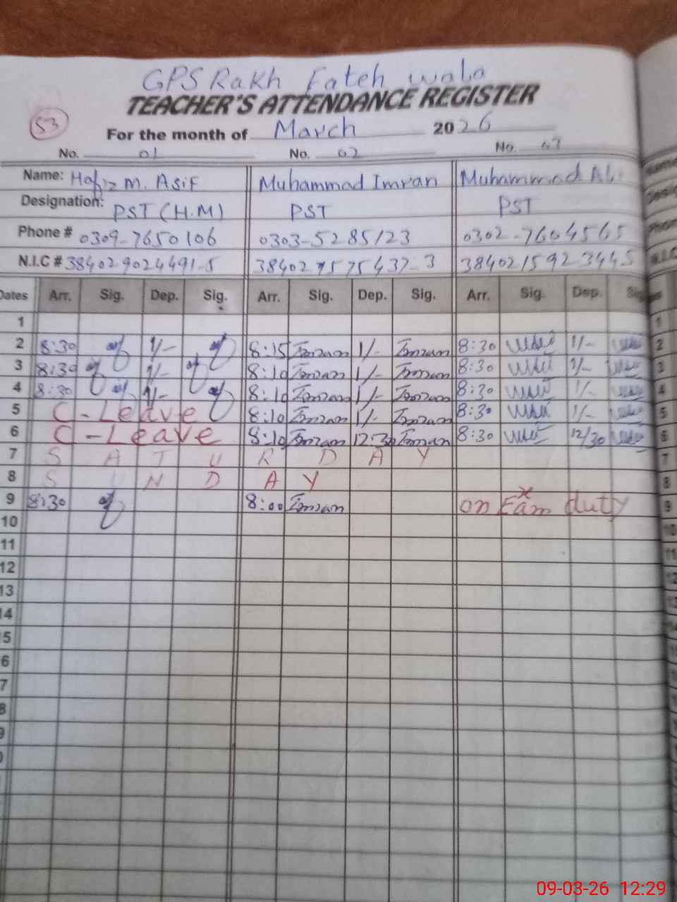 | CNIC | Full Name | Designation | R/C | Absence During Last Calender Month |