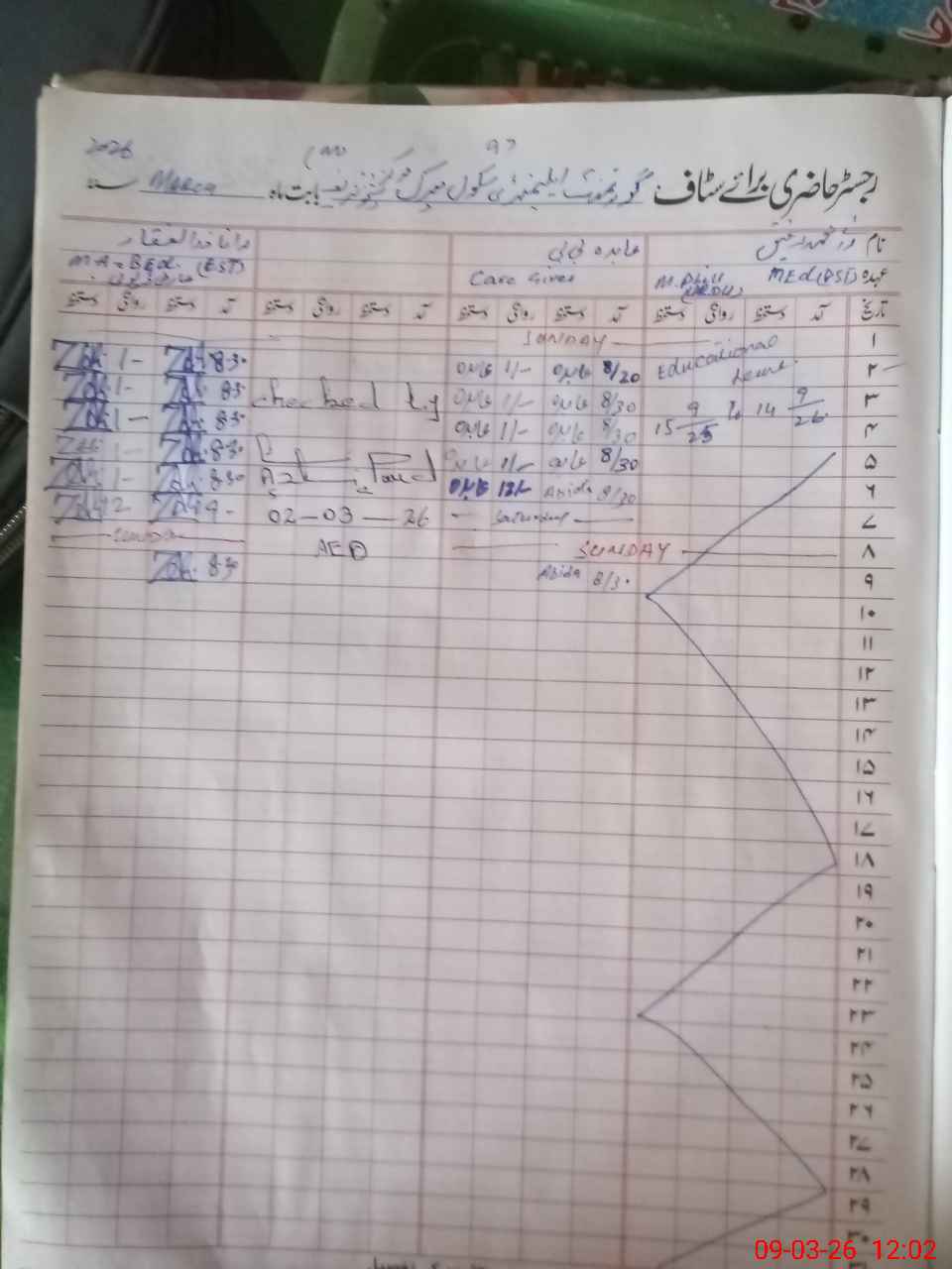 | Remarks (Use Separate Page if Required): EST Zulfiqar Ali on T/duty from GES Tariq abad was present in the school | |||||
