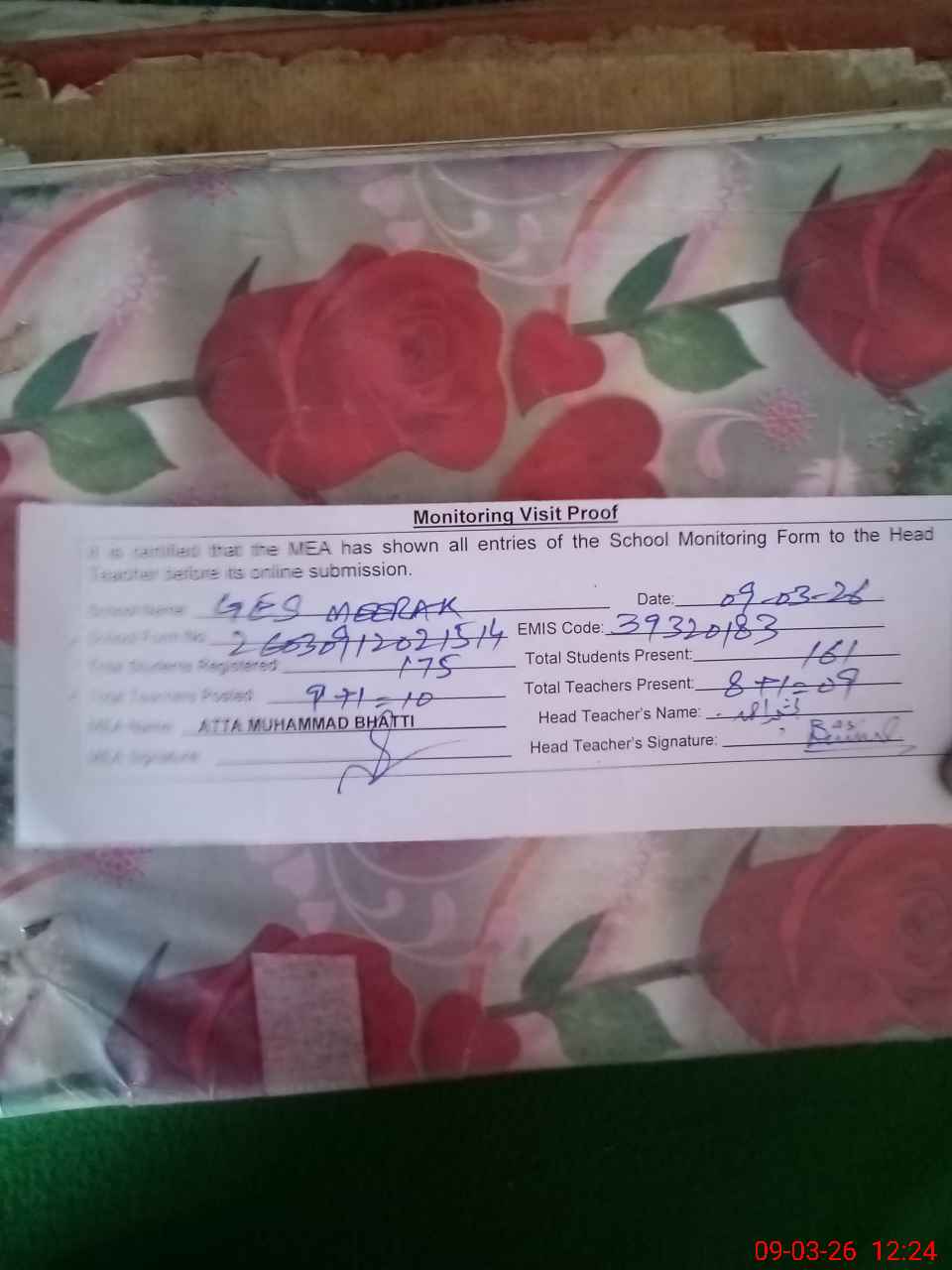 | Attendance Register | Head Teacher | MEA with School | Visit Proof |
