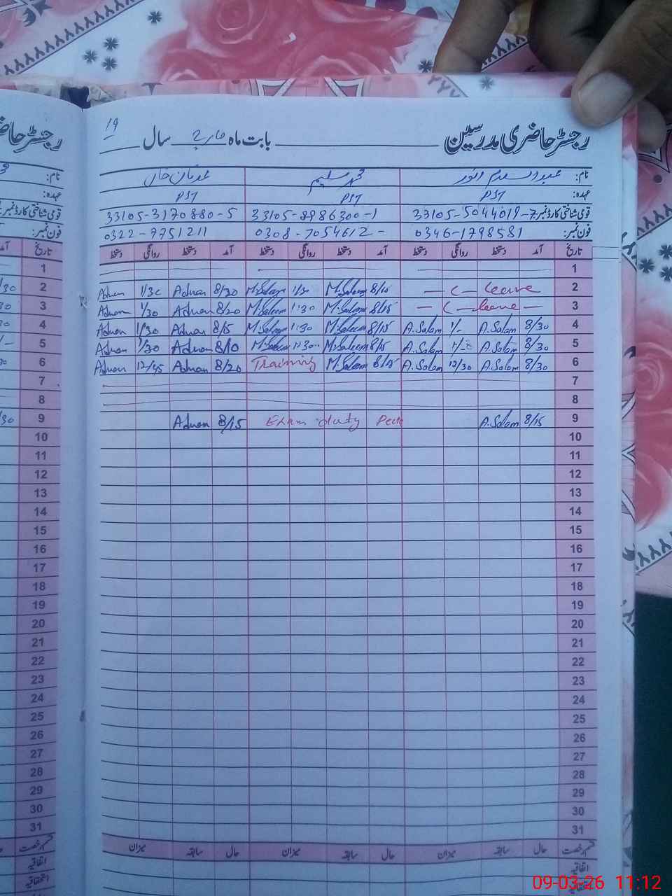 | CNIC | Full Name | Designation | R/C | Absence During Last Calender Month |