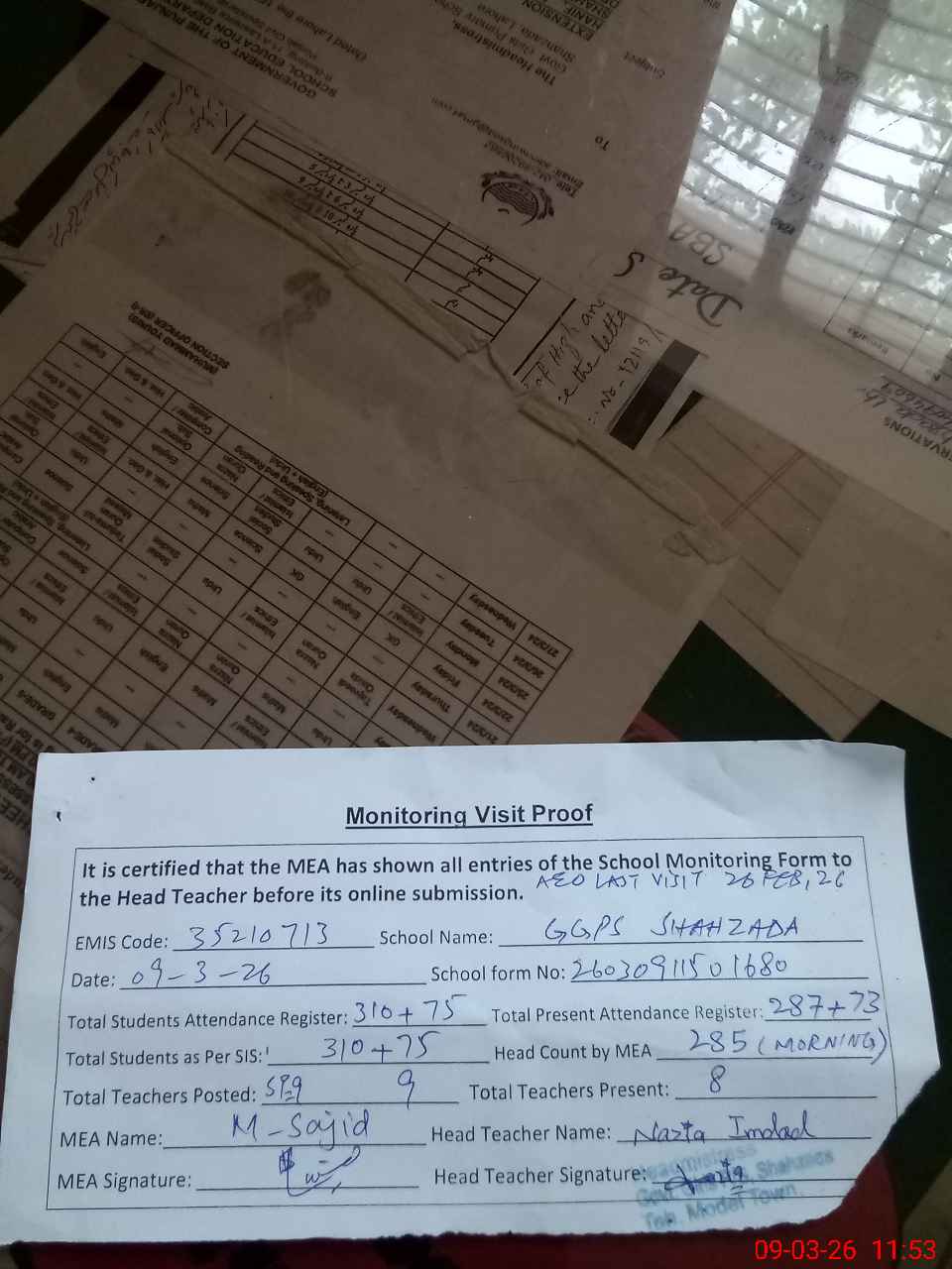 | Attendance Register | Head Teacher | MEA with School | Visit Proof |