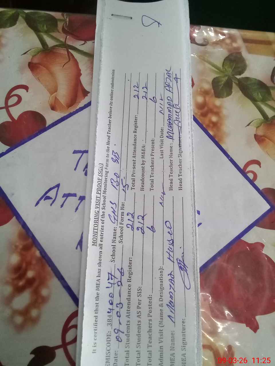 | Attendance Register | Head Teacher | MEA with School | Visit Proof |