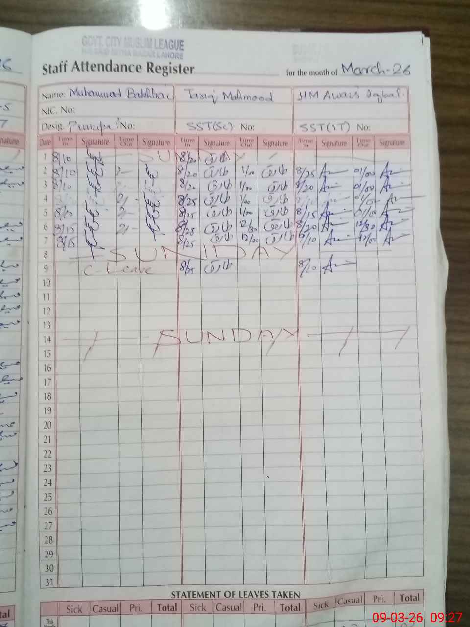 | 35**** | Na**** Ak**** | PST Arts | Regular | 2 | 0 | 0 | 0 | 0 | 0 | 0 | 0 | 2 | Exam Duty |