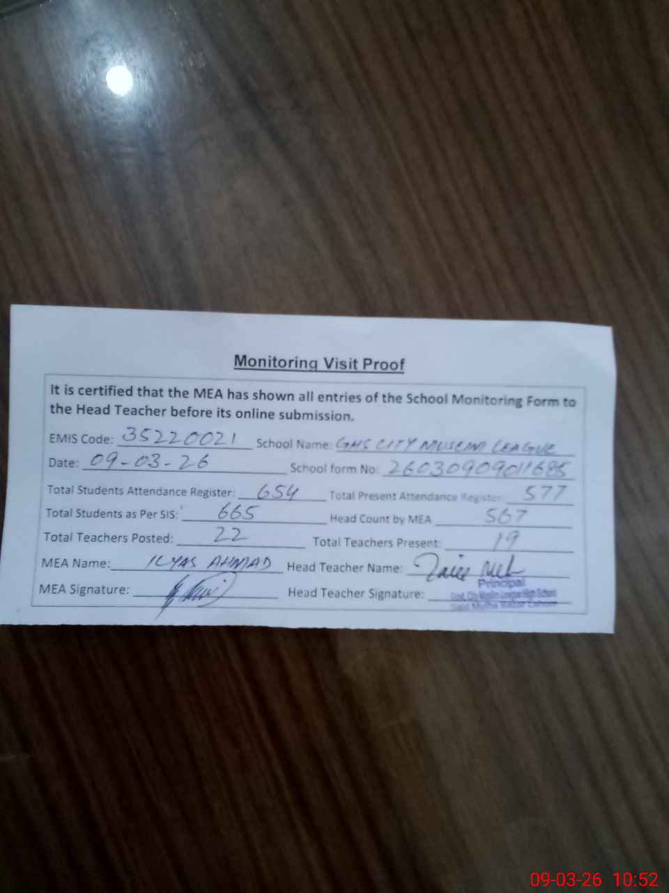 | Attendance Register | Head Teacher | MEA with School | Visit Proof |