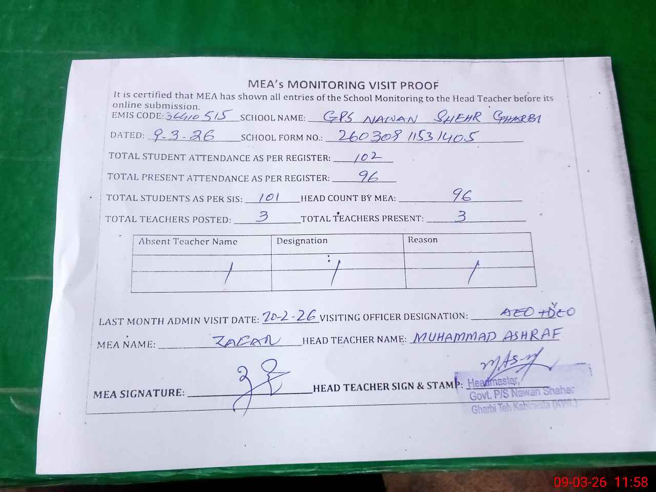 | Attendance Register | Head Teacher | MEA with School | Visit Proof |