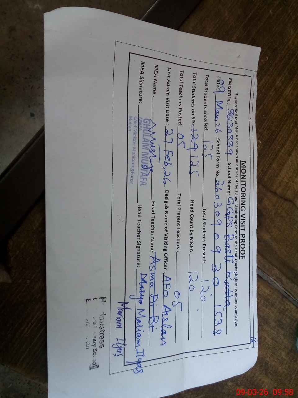 | Monitoring Date: 09-03-2026 | Start Time: 09-03-2026 09:27 AM | End Time: 09-03-2026 09:59 AM | Name of MEA: Gh**** Mu**** | |