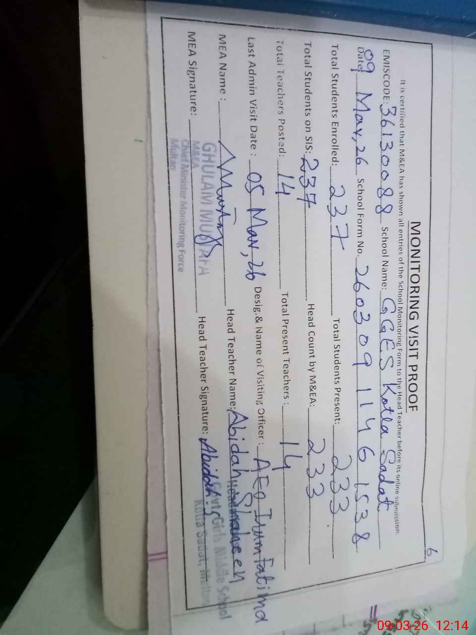 | EMIS Code: 36130088 | Name of School: GGES KOTLA SADAT NEAR SADIQ ABAD MULTAN | |||