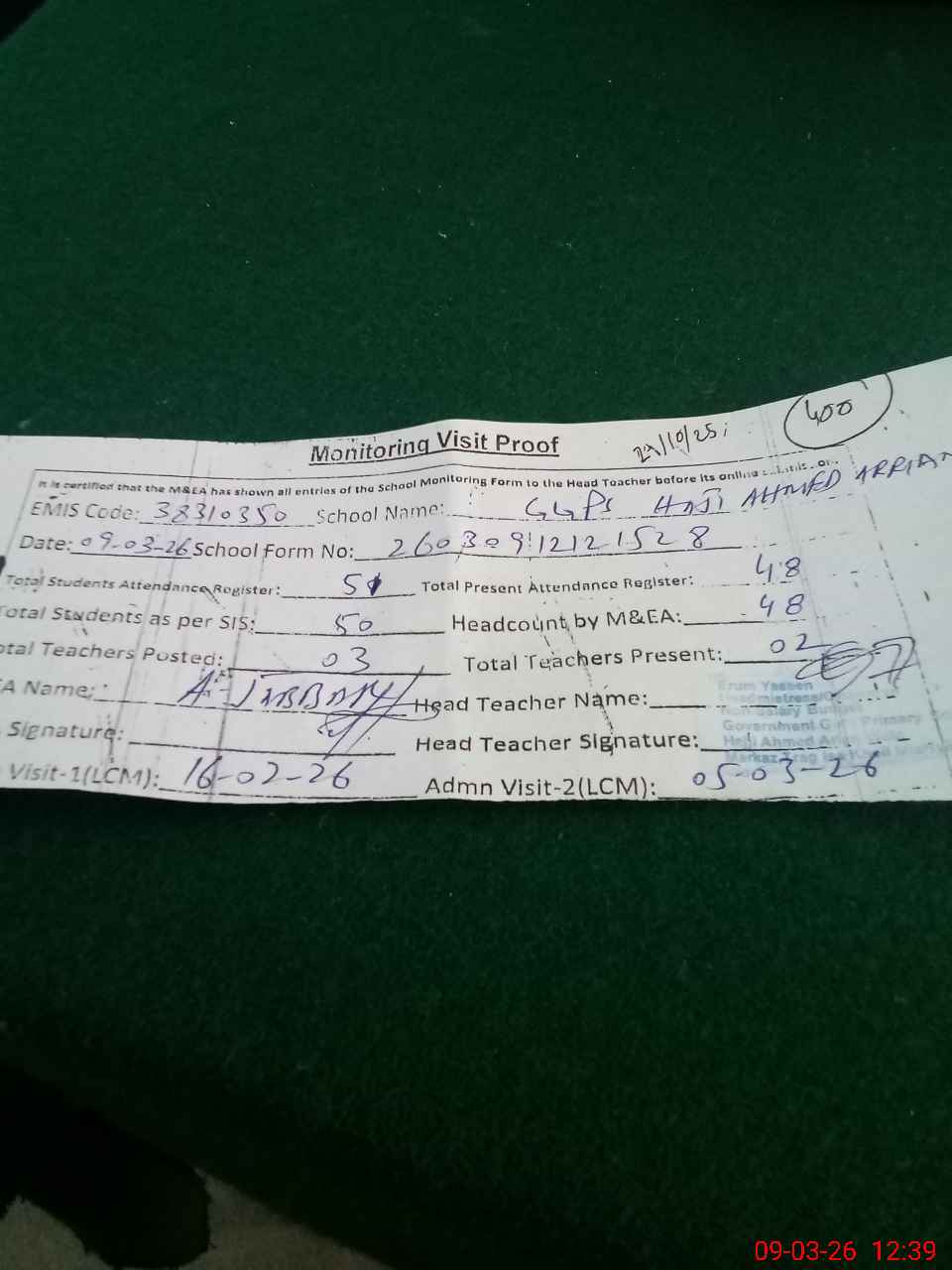 | Attendance Register | Head Teacher | MEA with School | Visit Proof |