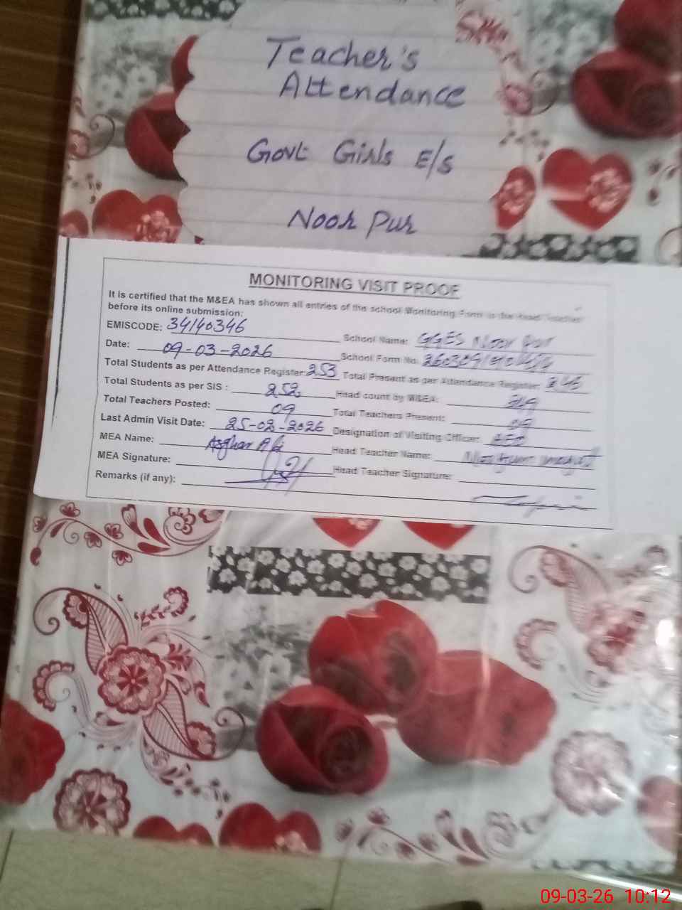 | Attendance Register | Head Teacher | MEA with School | Visit Proof |