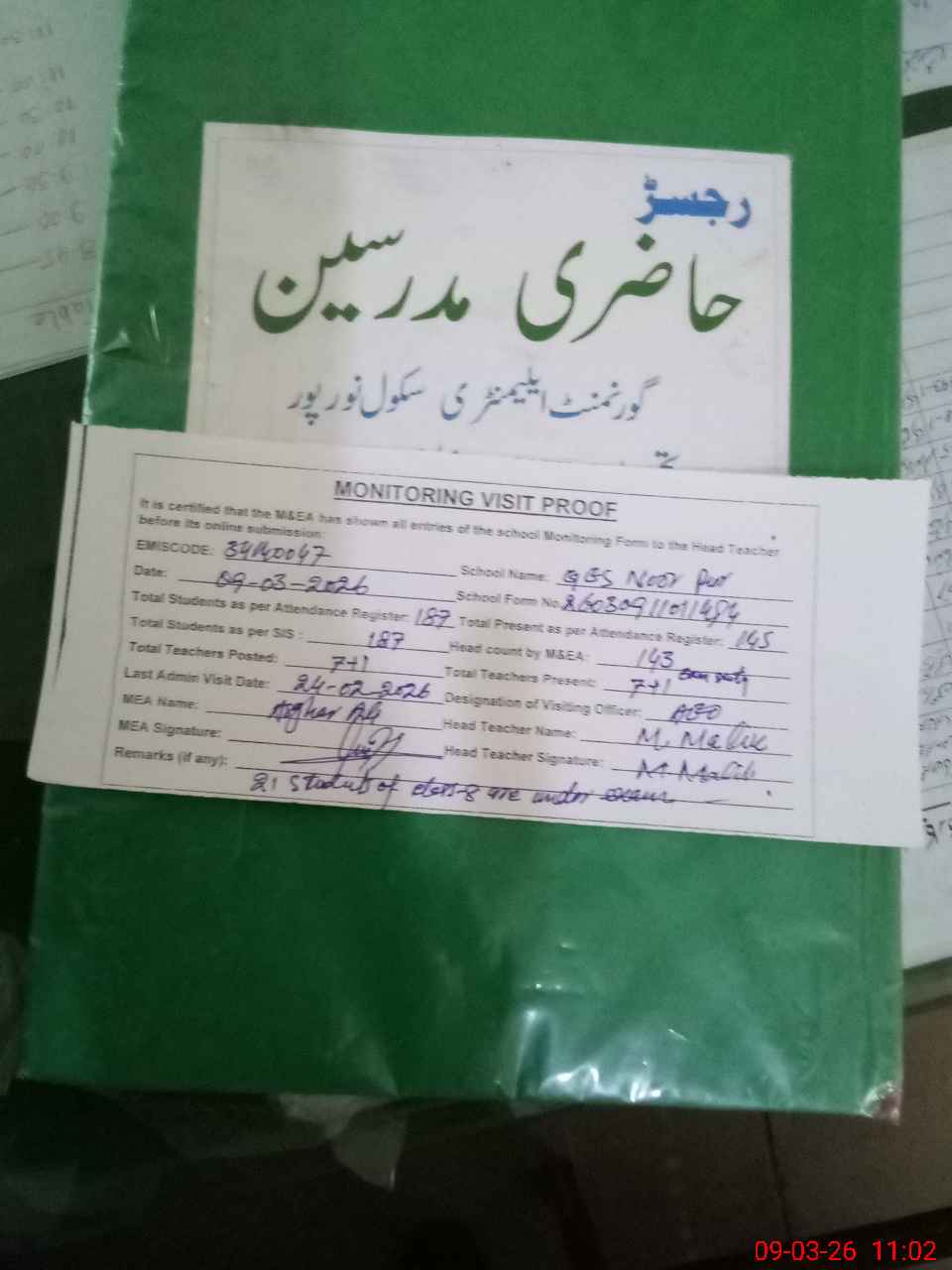 | Attendance Register | Head Teacher | MEA with School | Visit Proof |