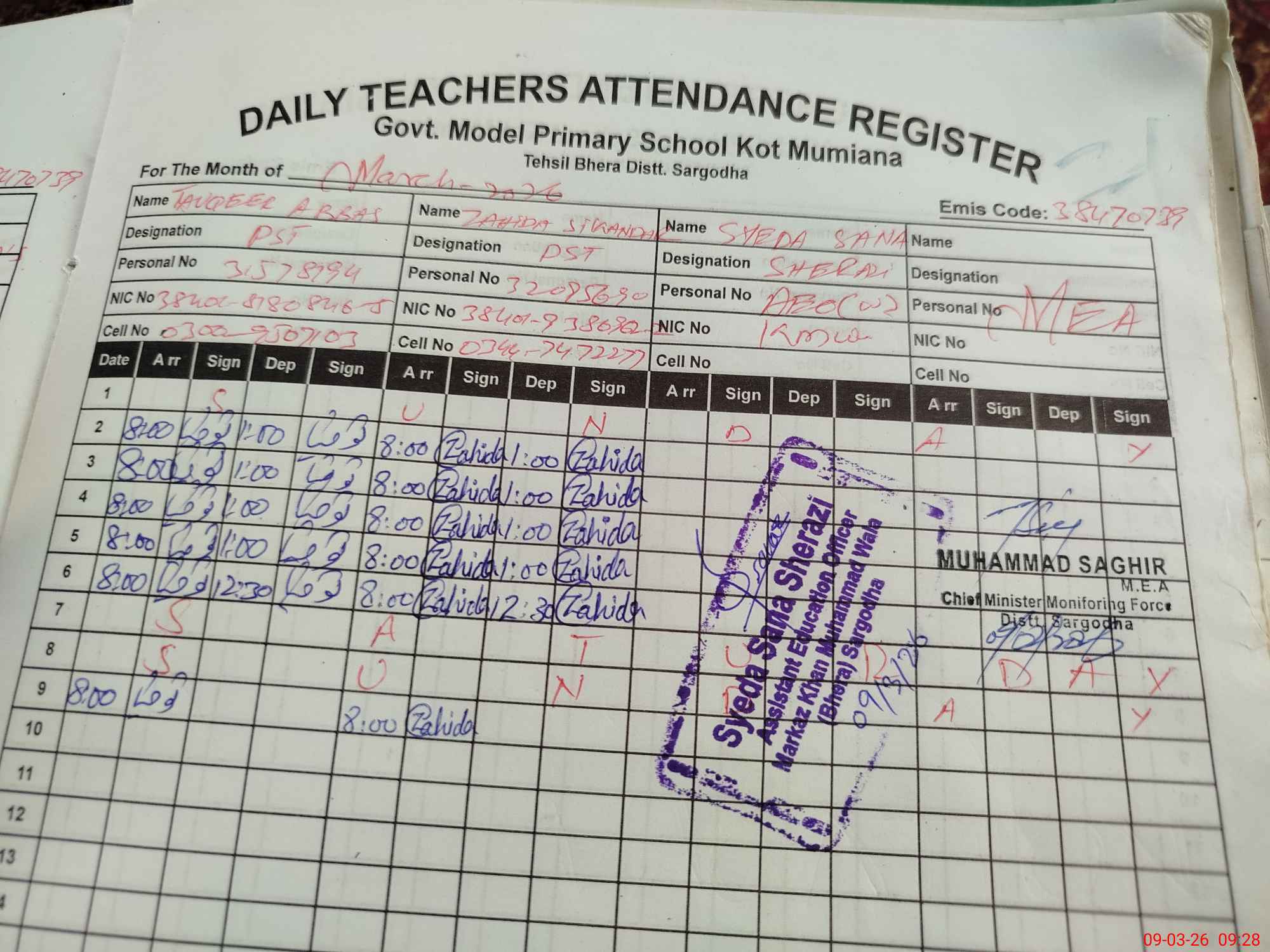 | Name: TA**** AB**** Designation: (School Headmaster's/Headmistress's) PST ( SCI-MATH) Phone/Cell Number: 03**** |