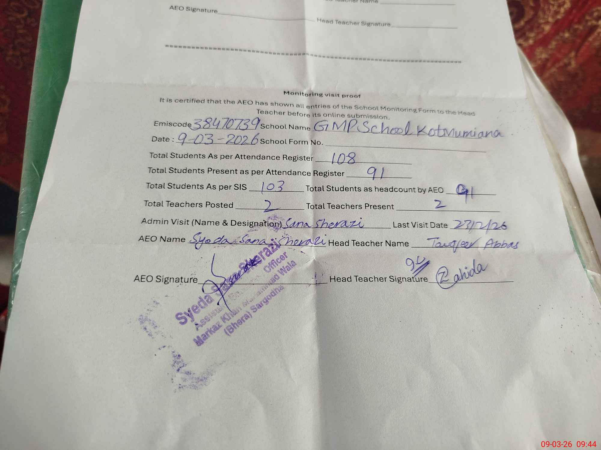 | Attendance Register | Head Teacher | MEA with School | Visit Proof |