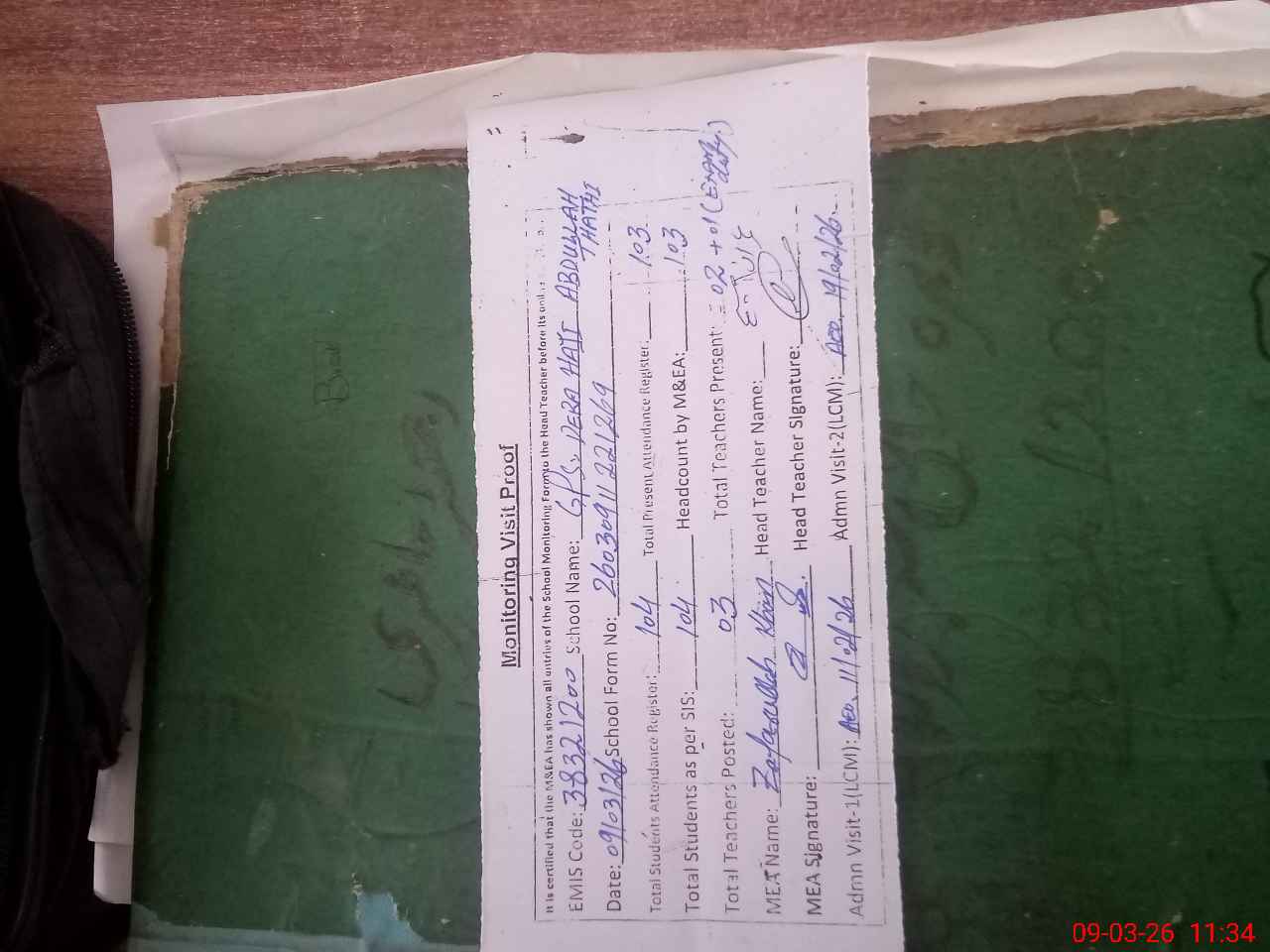 | Attendance Register | Head Teacher | MEA with School | Visit Proof |