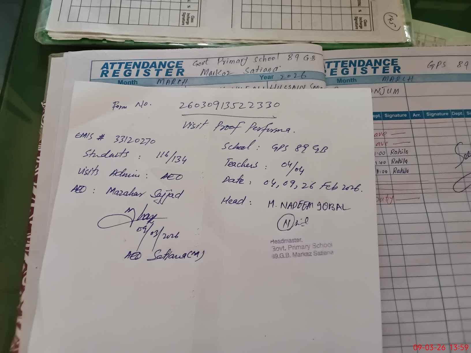 | Attendance Register | Head Teacher | MEA with School | Visit Proof |