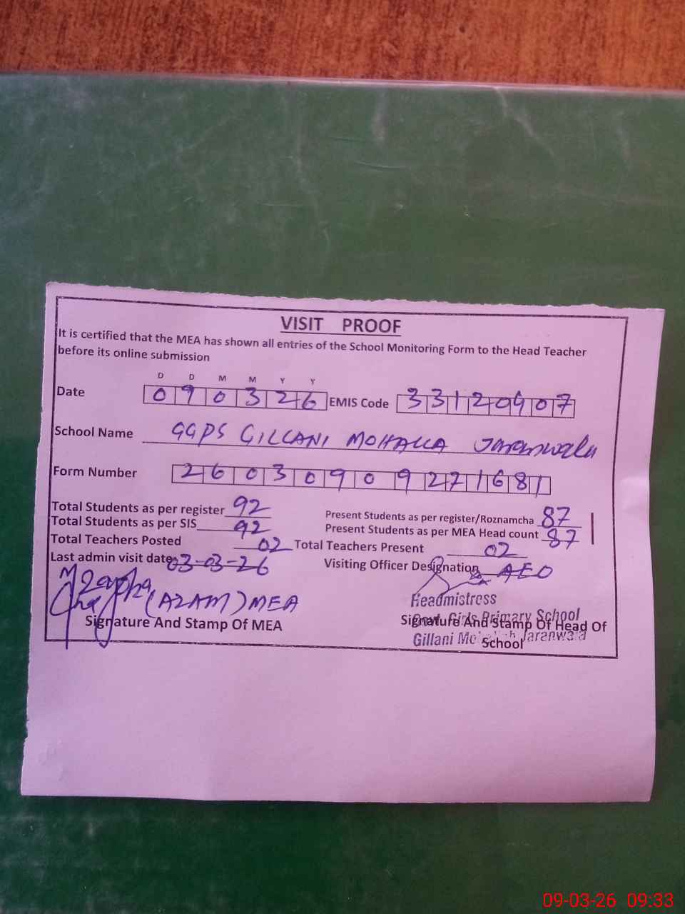 | Attendance Register | Head Teacher | MEA with School | Visit Proof |