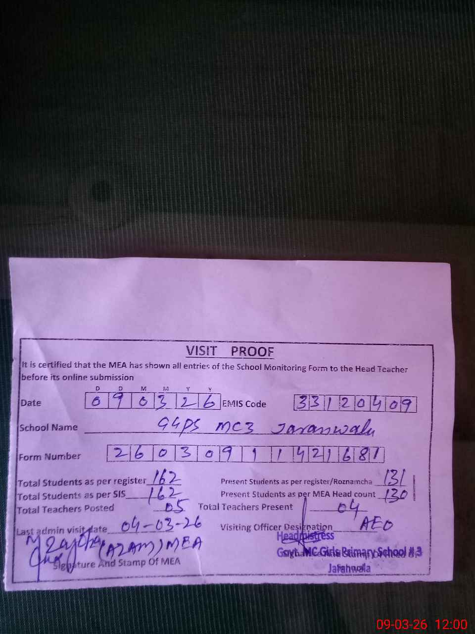 | Attendance Register | Head Teacher | MEA with School | Visit Proof |