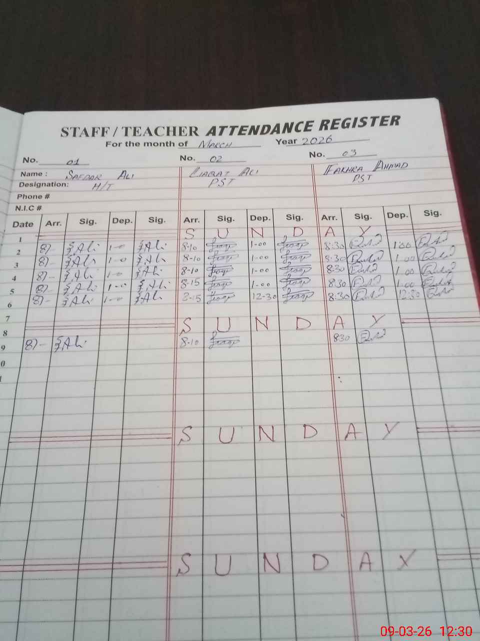| CNIC | Full Name | Designation | R/C | Absence During Last Calender Month |