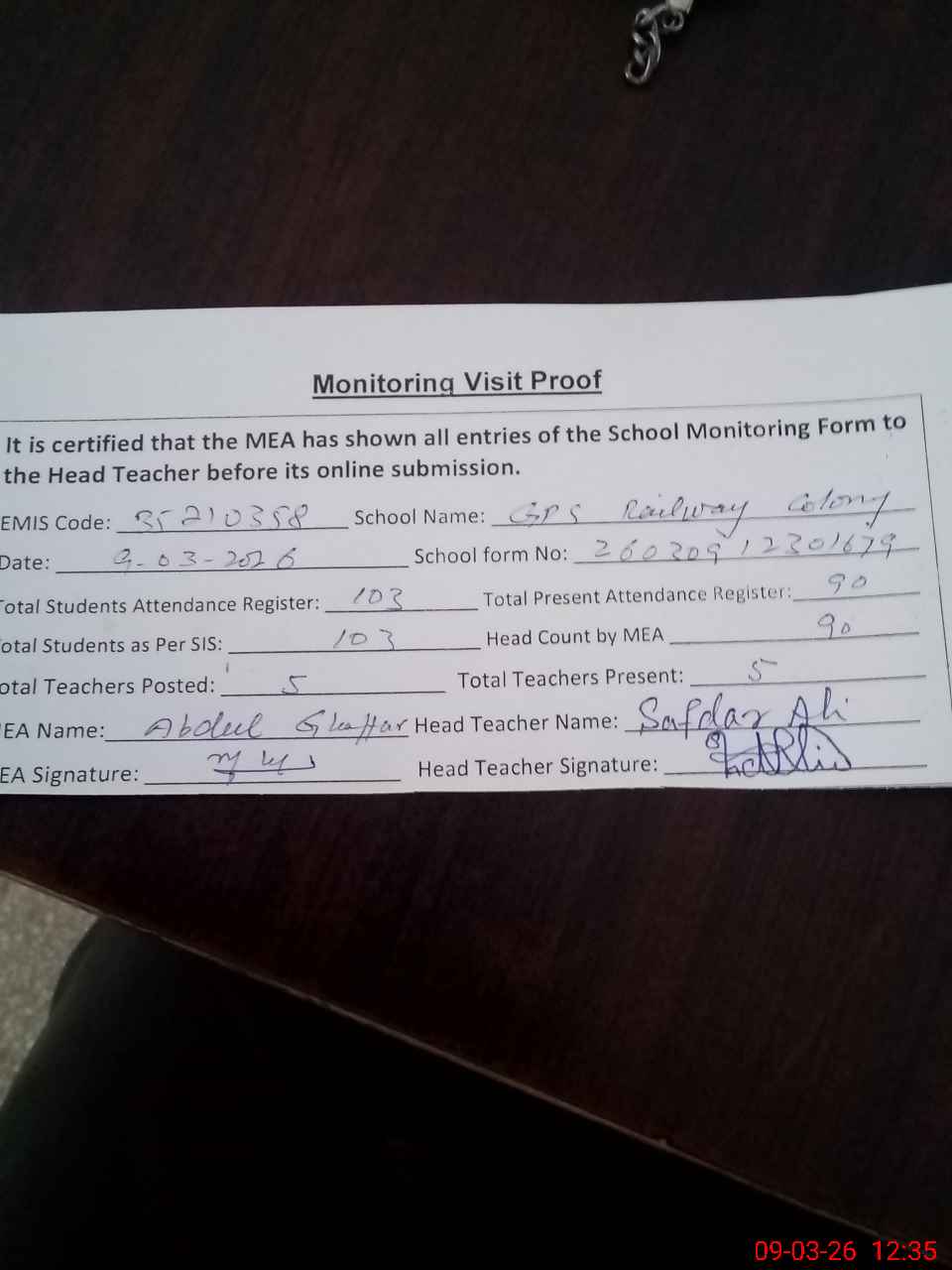 | Attendance Register | Head Teacher | MEA with School | Visit Proof |