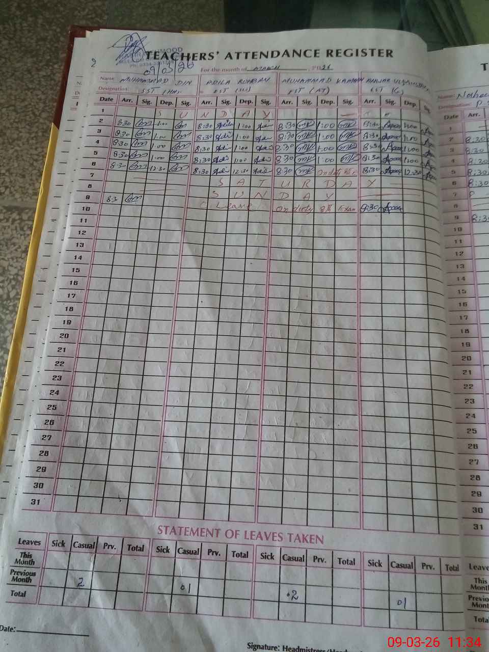 | Remarks (Use Separate Page if Required): EST Adila Rohban found authorised absent head teacher marked the c leave on attendance register and when I ask to show the leave of said teacher head teacher went from his office and after 5 minutes came in office his leave approved by head on 11.15 am I mark EST Adila Rohban unauthorised absent second all classes found in dirty condition submitted pls | |||||