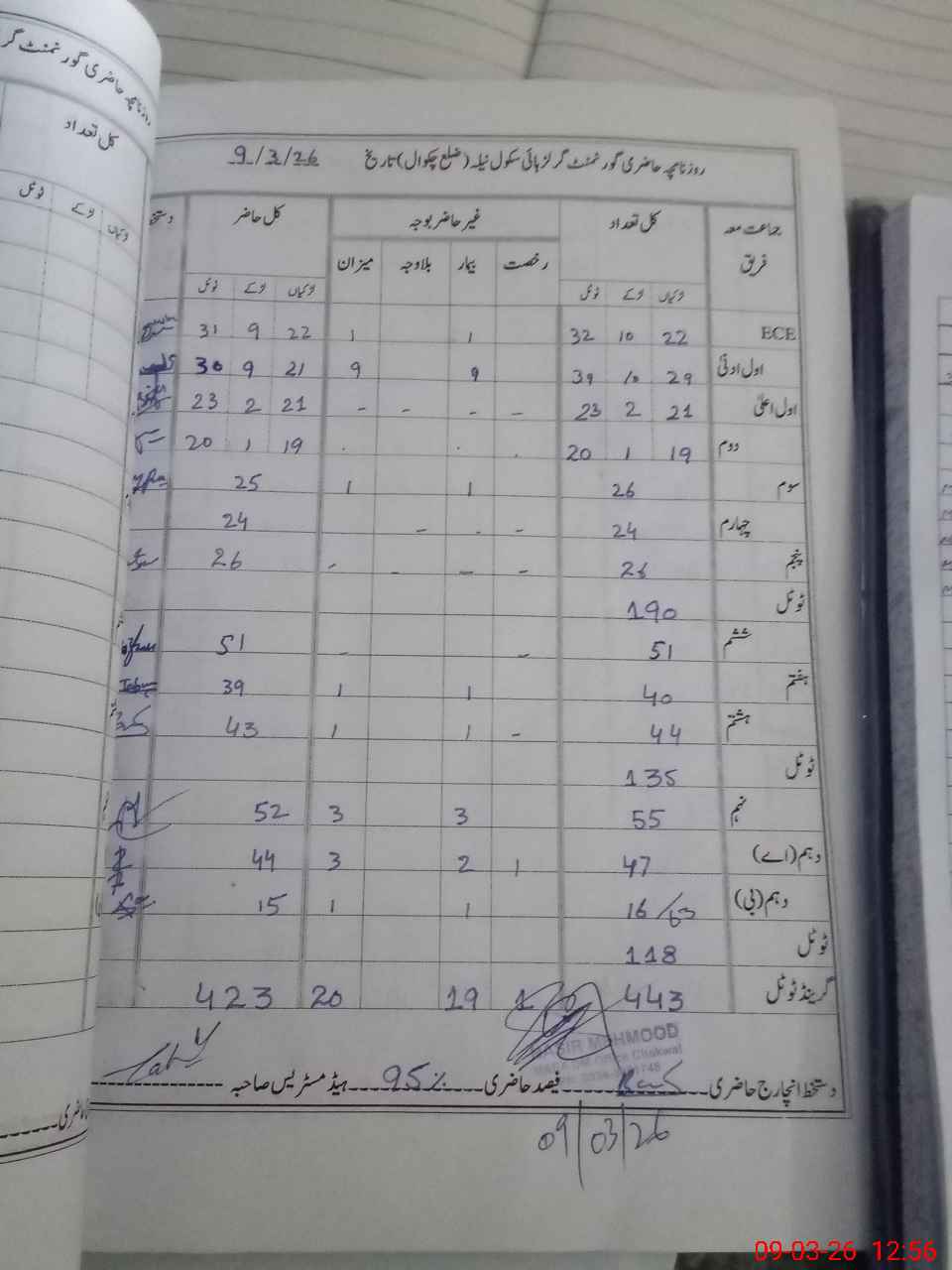 | Total Students Present | 0 | 31 | 23 | 20 | 25 | 24 | 26 | 51 | 39 | 43 | 52 | 59 | 423 | |||