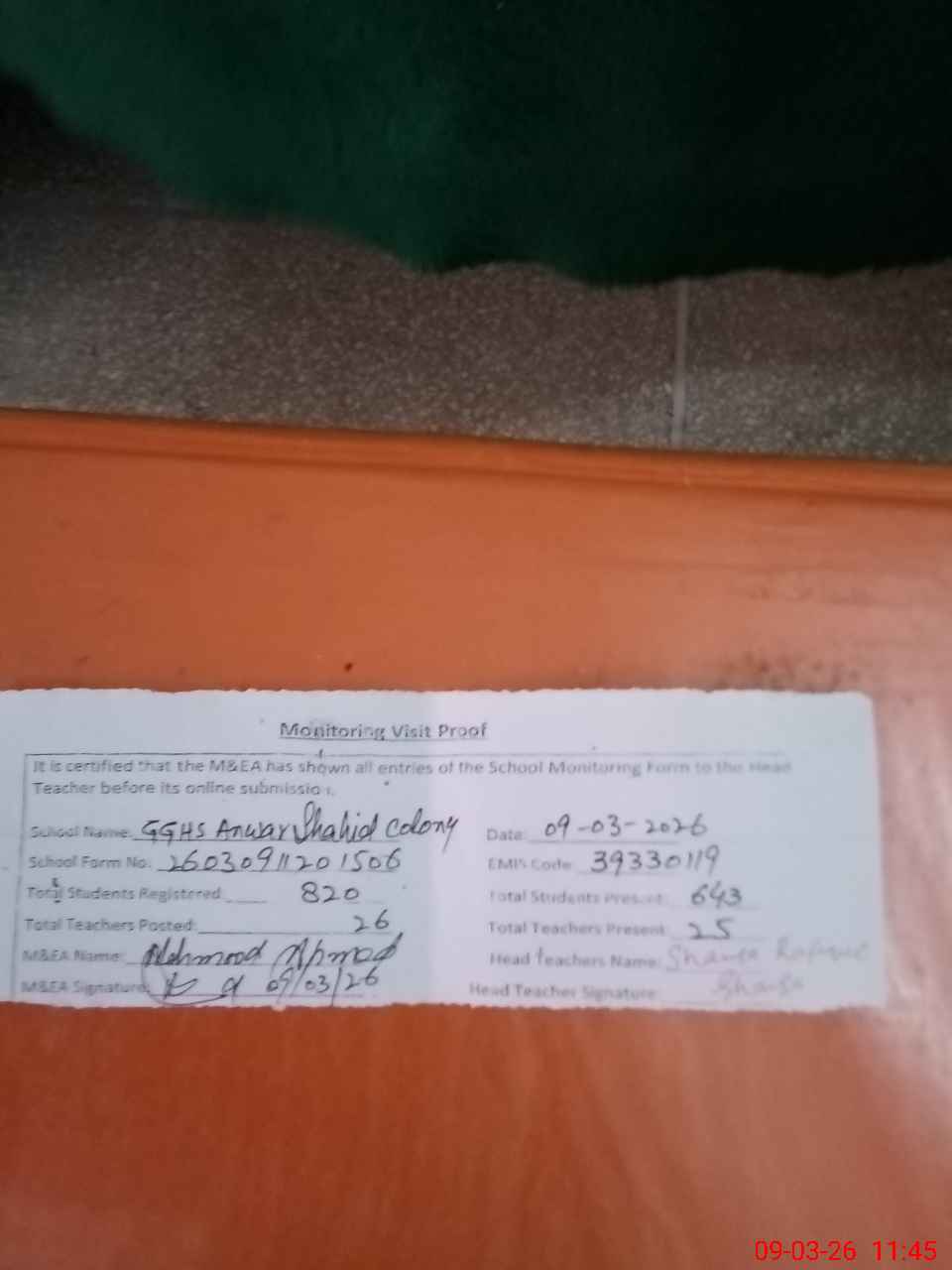 | Attendance Register | Head Teacher | MEA with School | Visit Proof |