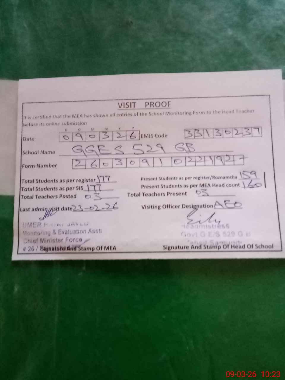 | Attendance Register | Head Teacher | MEA with School | Visit Proof |