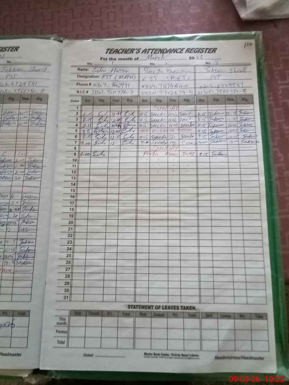 | Name: SI**** HA**** Designation: (School Headmaster's/Headmistress's) EST (MATH) Phone/Cell Number: 03**** |