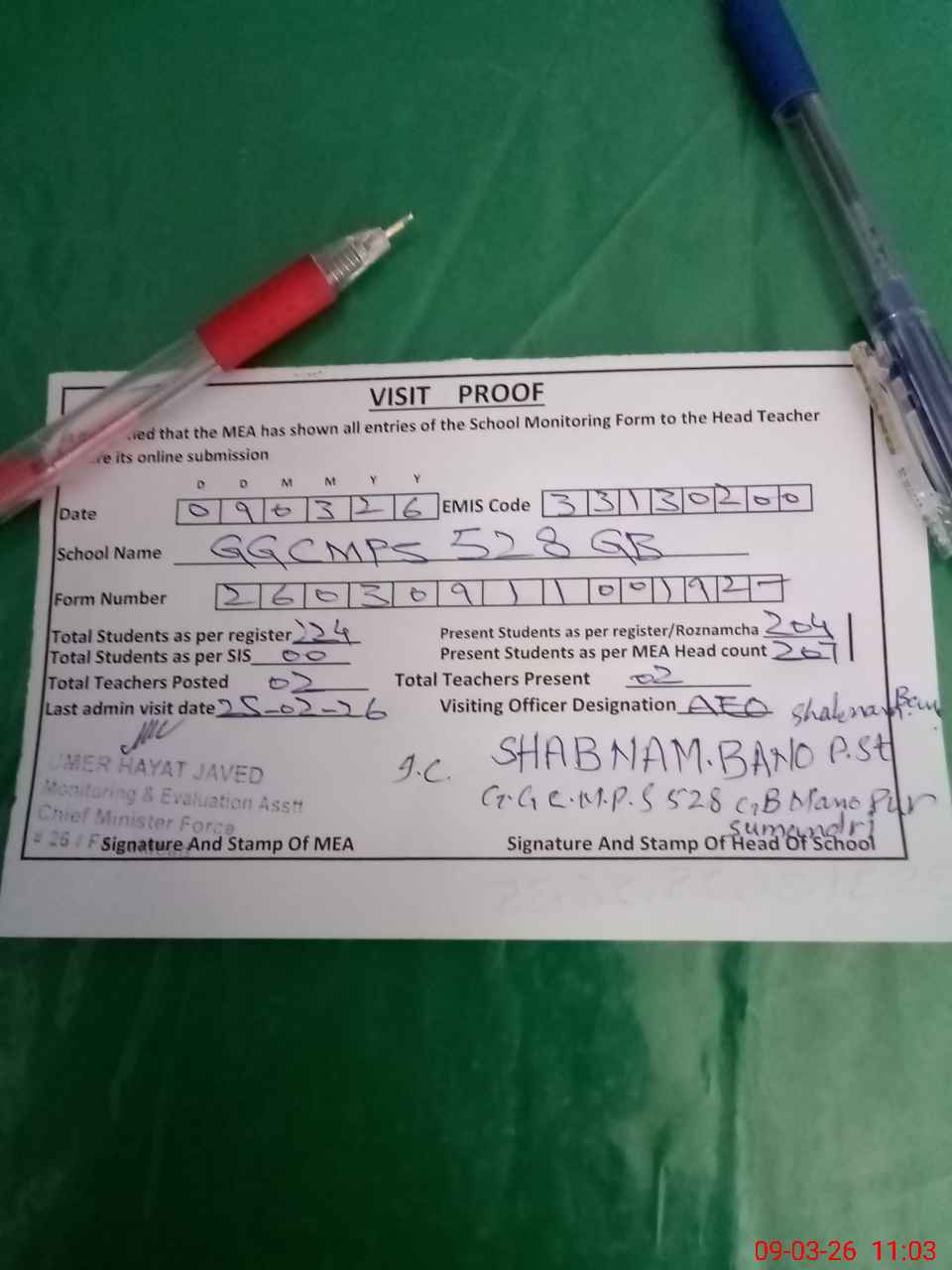 | Remarks (Use Separate Page if Required): SCHOOL STAMP AND SCHOOL TAB WERE NOT AVAILABLE IN THE SCHOOL AT THE TIME OF VISIT 02 STI WERE WORKING IN THIS SCHOOL | |||||