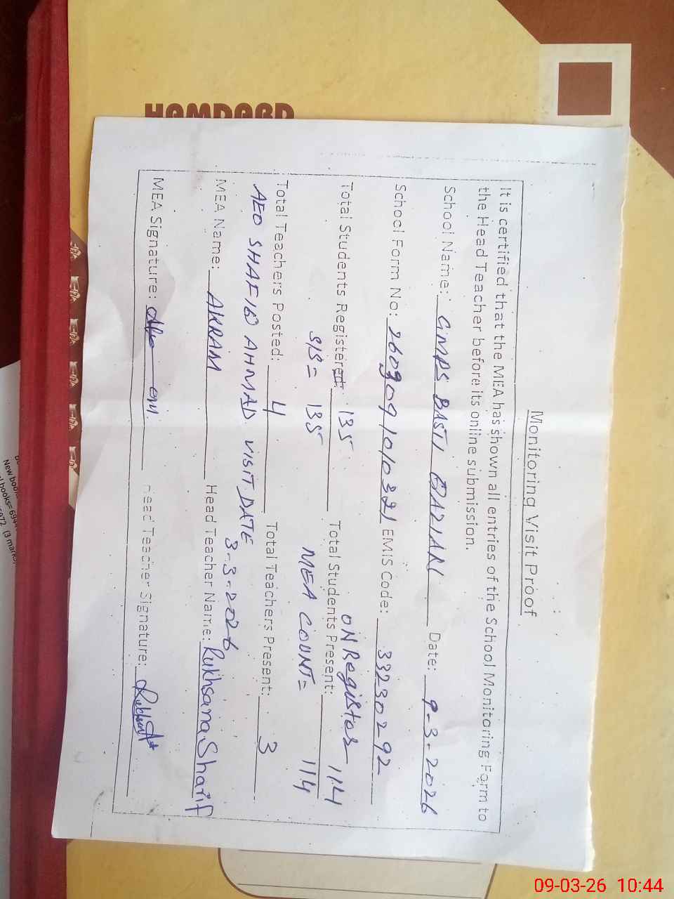 | Attendance Register | Head Teacher | MEA with School | Visit Proof |